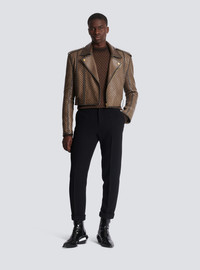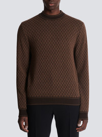 Mini monogram jacquard fine knit jumper - Contrasting funnel neck - Plain back - Contrasting knit stripes along the sleeves - Contrasting ribbed cuffs, waist and collar - Embroidered Pierre Balmain label on the back - Model measures 187cm and wears a size M - Material: 100% mohair - Made in France - Item: BH0KD036KF23