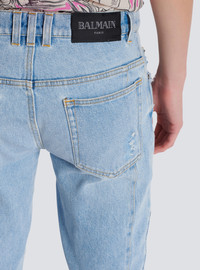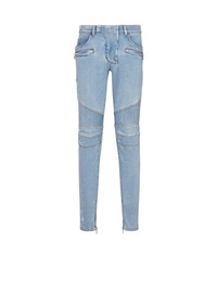 Light blue denim biker jeans - Slim leg - Fitted - Ribbed knees - 5 classic pockets - 2 visible zip pockets, Balmain Paris-engraved slider - FlyZip and press-stud fastening under a placket - Visible zip at the ankles, Balmain Paris-engraved slider - Engraved rivets - Waistband with belt loops and a triple belt loop at the back - Woven label with vintage Balmain logo - Silver hardware - Light blue wash - Model measures 189cm and wears a size 30 - Main material: 97% cotton 3% elastane - Made in Italy - Item: DH1MG009DE59