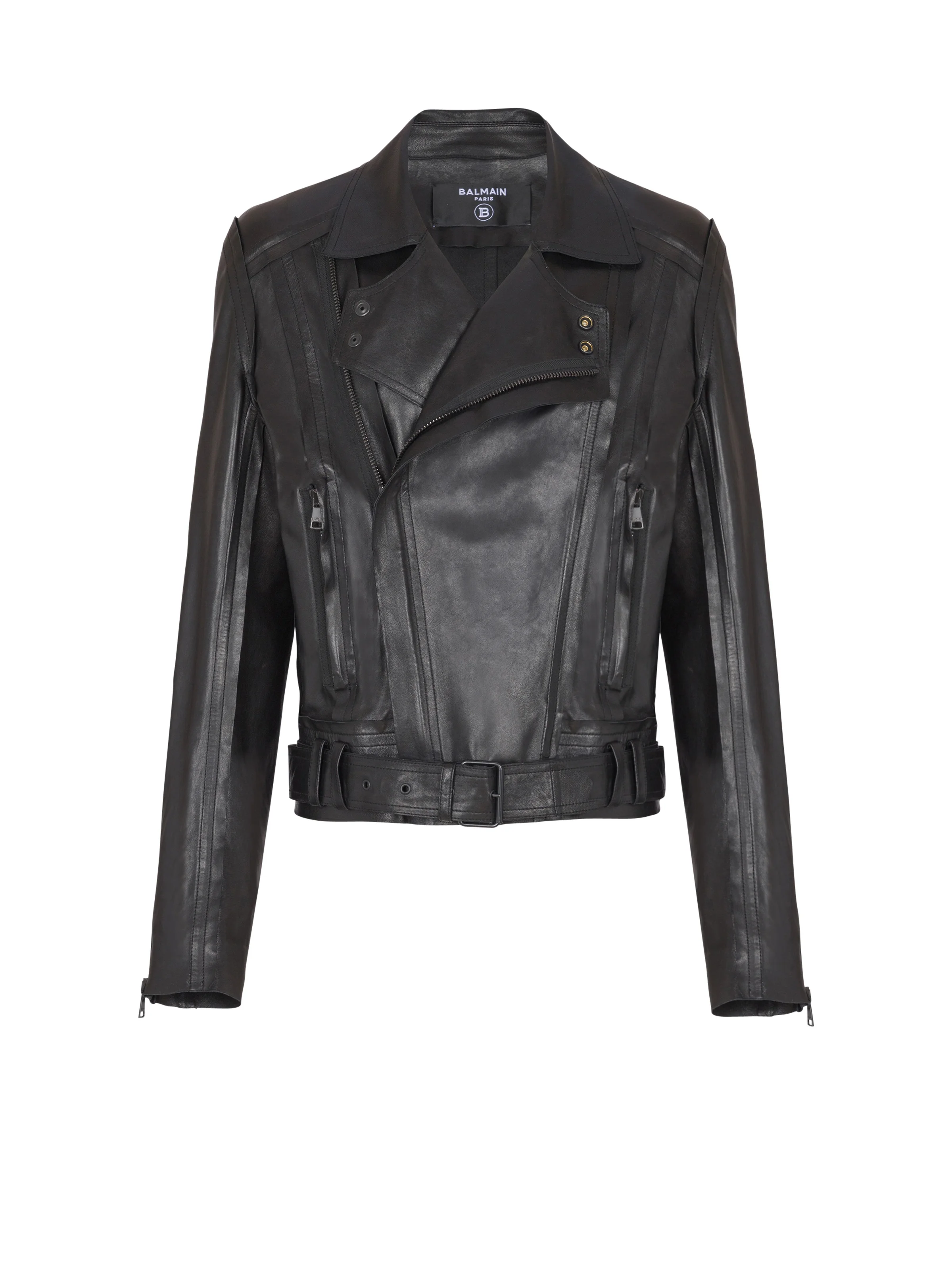 Lightweight lambskin leather biker jacket - Shirt collar with press stud buttons - Long sleeves with visible zips on the cuffs - Asymmetrical fastening with a visible zip and press studs - Detachable belt with double loop - 2 side pockets with visible zip - Raw hems - Matching hardware - Balmain-engraved press studs and sliders - Straight cut - Model measures 190cm and wears a size 48 - Main material: 100% lambskin - Made in Turkey - Item: FH1TD625LD63