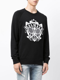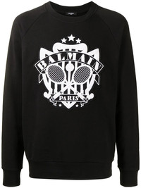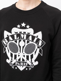 logo-embellished sweatshirt One for lovers of tennis, this cotton sweatshirt from Balmain is decorated with a tennis racket-embellished crest motif on the front, which incorporates logo lettering. Imported Composition Cotton 100% SIZE & FIT Model measurements Height 6 ft 0 in(1.83 m) Bust/Chest 37.79 in(96 cm) Hips 37 in(94 cm) Waist 30.31 in(77 cm) FittingInformation This piece fits true to size. We recommend you get your regular size Cut for a relaxed fit Made with a mid-weight fabric Washing instructions Dry Clean Only