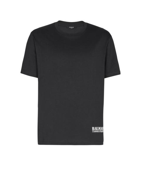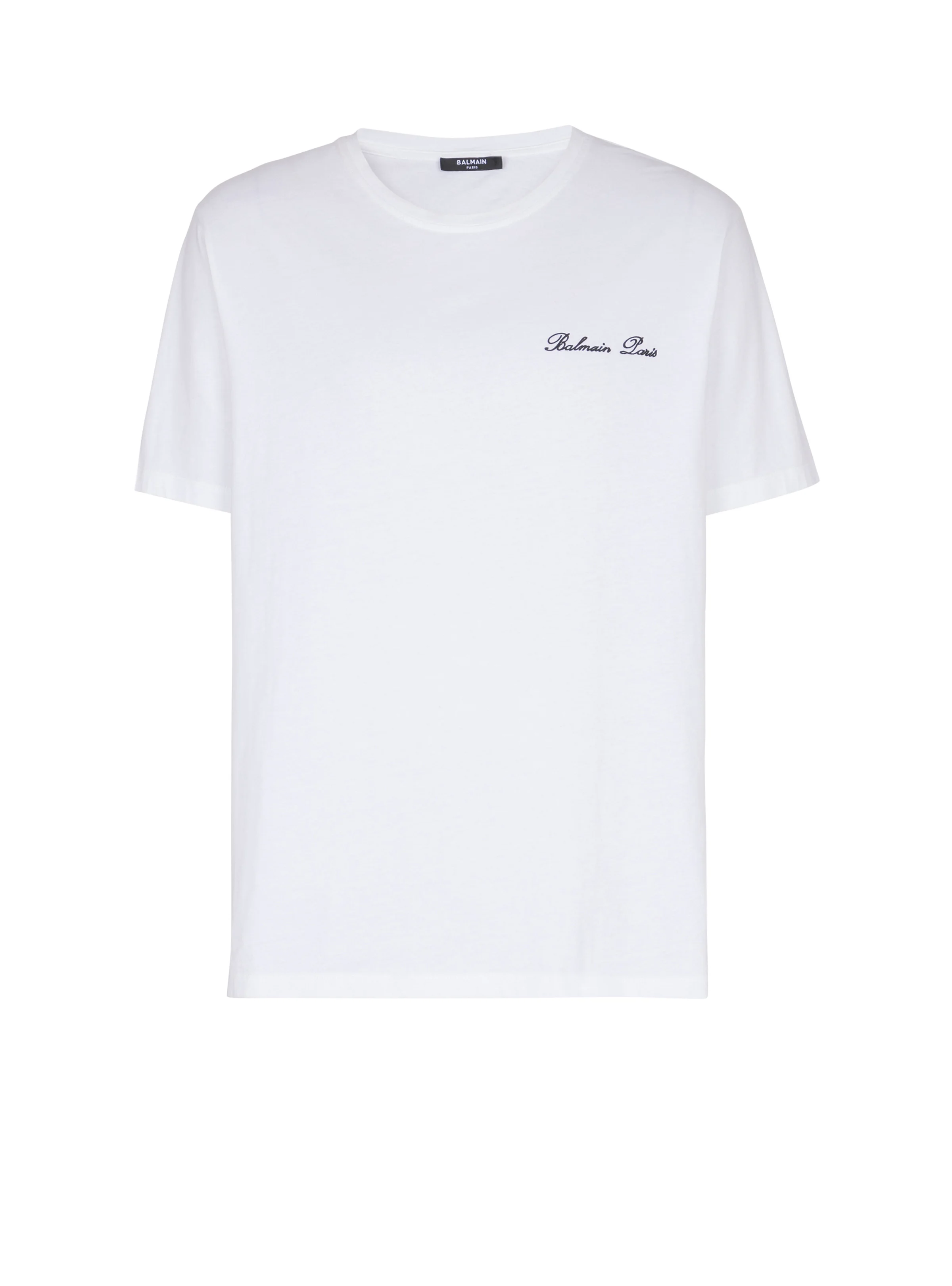Embroidered Balmain Signature T-shirt - Round neck with ribbed trim - Short sleeves - Contrasting Balmain Signature logo embroidered on the front and back - Regular fit - Model measures 190cm and wears a size M - Main material: 100% cotton - Made in Portugal - Item: FH1EG000BC68100% of the cotton fibres used to make this garment are certified and organically farmed