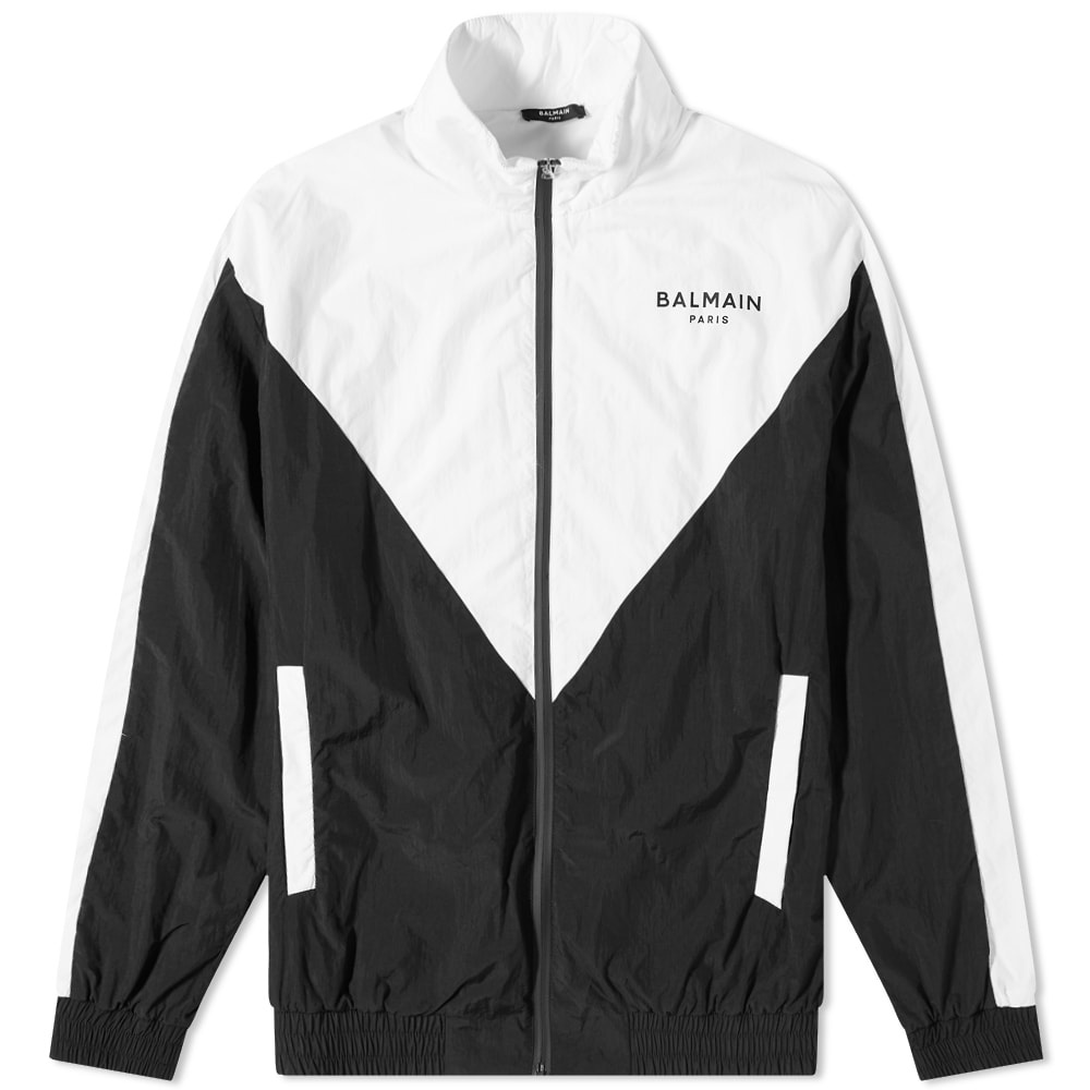 French fashion house Balmain offers a sporty-inspired look with this zip-up track jacket from its latest collection. Made from lightweight polyester, it’s detailed with a retro funnel neck and colour block pattern, then printed with the label’s signature Parisian branding at the chest. - 100% Polyester - Mock Neck - Zip Closure - 2 Side Pockets - Printed Branding - Elasticated Trims - Made in Italy