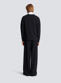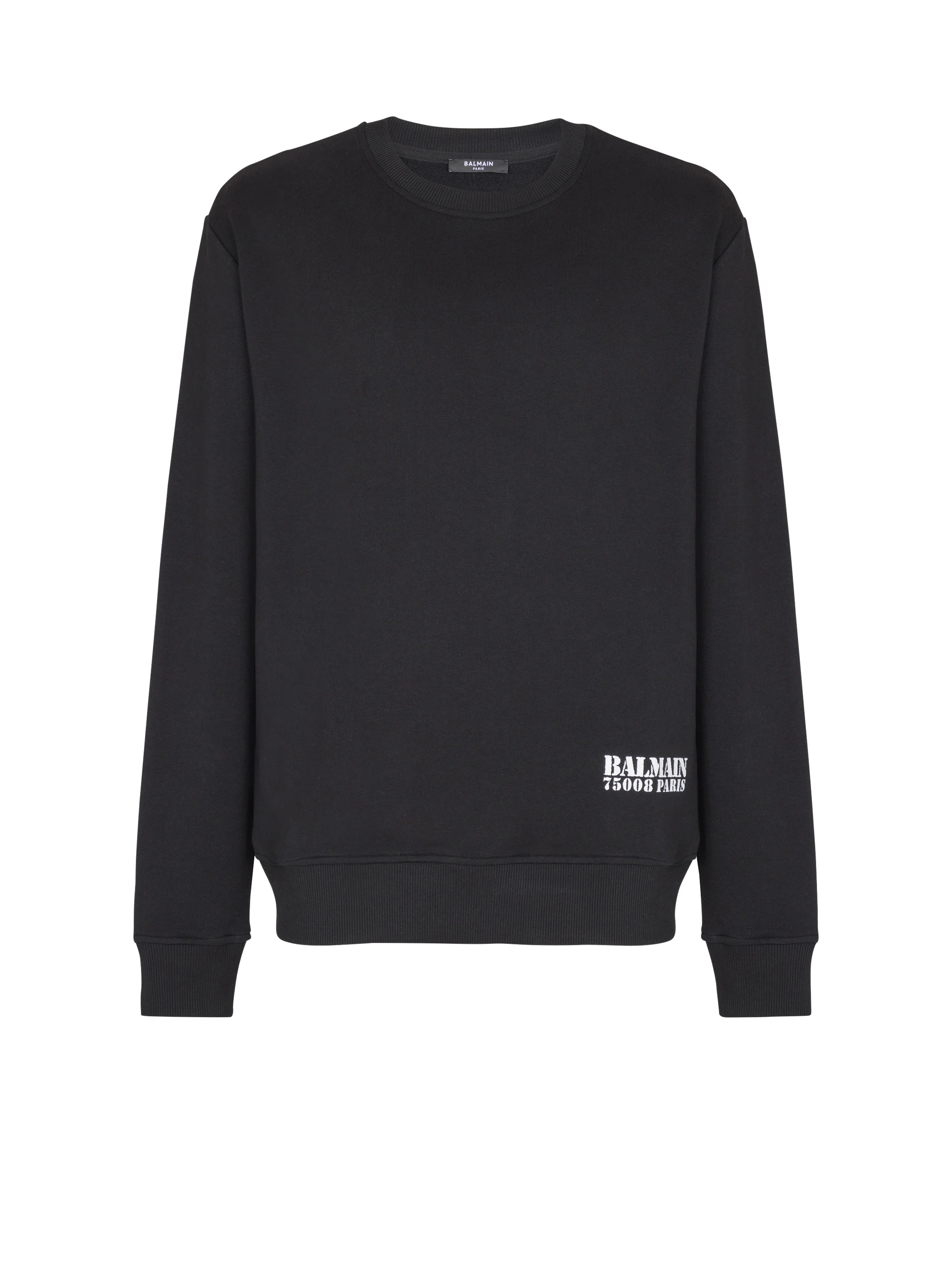 Small Balmain Stamp printed sweatshirt - Round neckline - Long sleeves - Contrasting Small Balmain Stamp print on the side - Ribbed trim - Regular fit - Model measures 190cm and wears a size M - Main material: 100% cotton - Made in Portugal - Item: FH1JS001BD04100% of the cotton fibres used to make this garment are certified and organically farmed