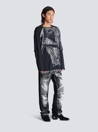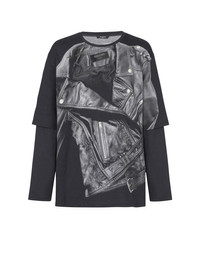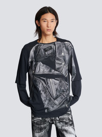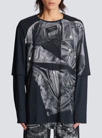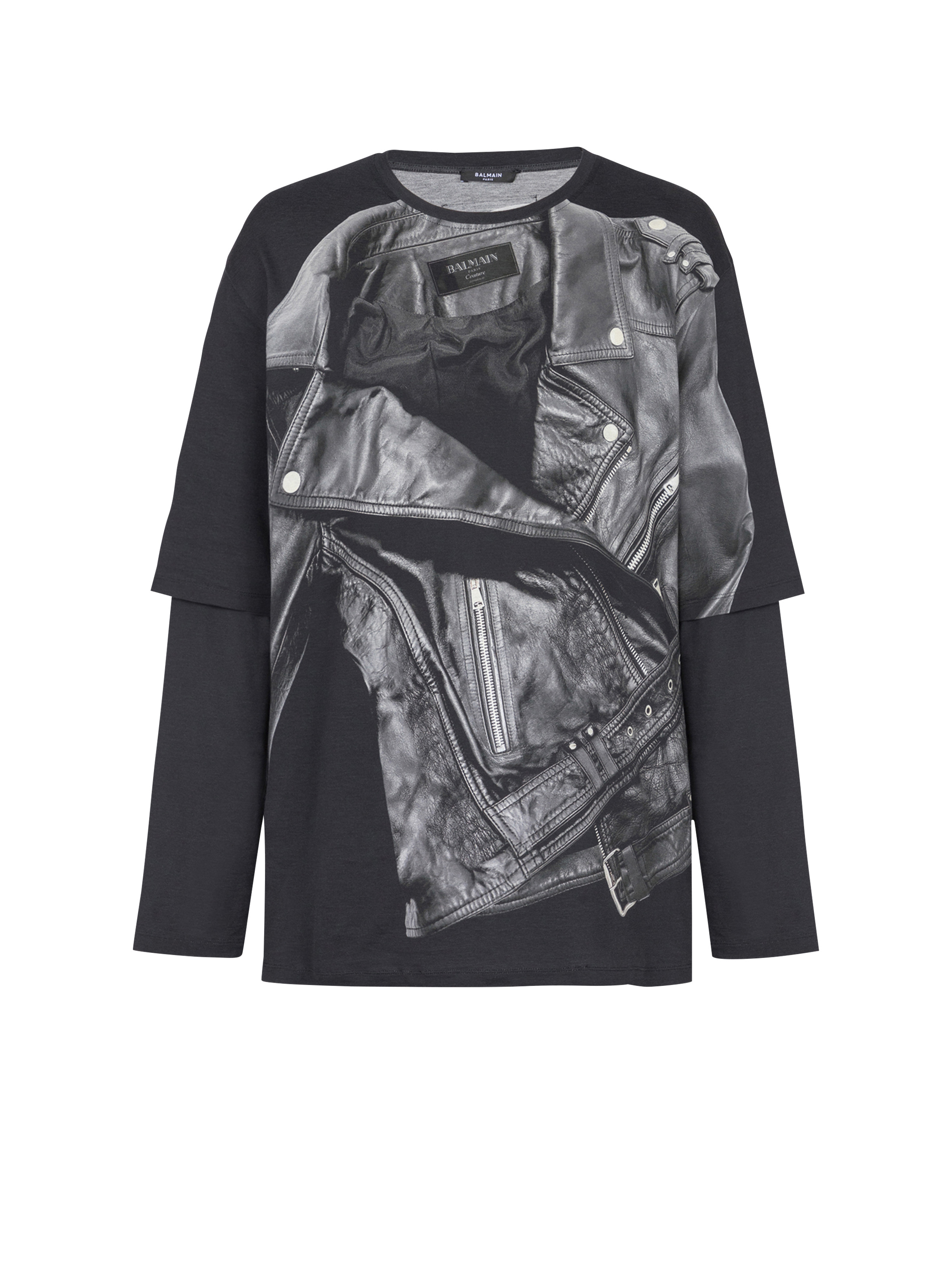 Long-sleeved T-shirt with biker jacket print - Round neckline - Double sleeves, short over long - Contrasting optical illusion printed on the front and back - Woven Balmain Couture label on the back - Oversized fit - Model measures 186cm and wears a size M - Main material: 100% cotton - Made in Bulgaria - Item: EH1EM016GE40