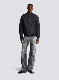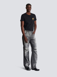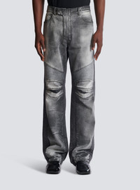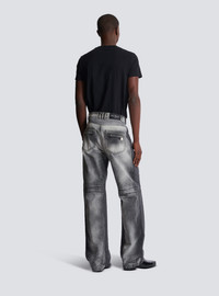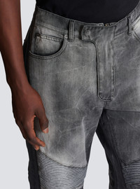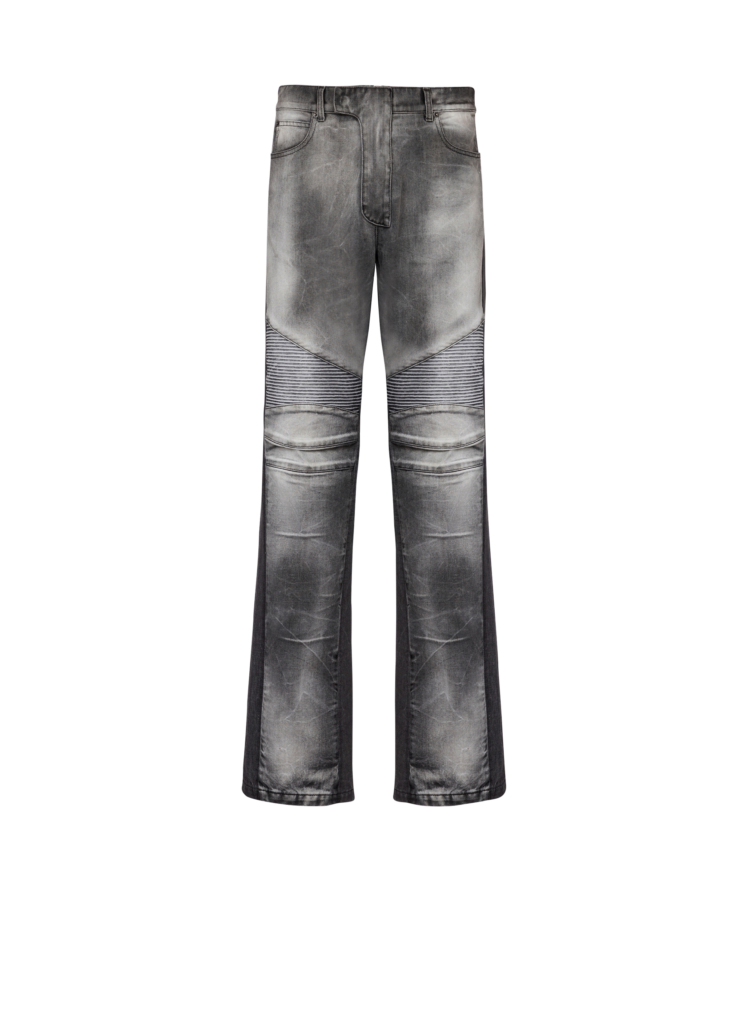 Loose-fit biker jeans in grey denim - Waistband - Triple belt loop on the back - Fly - Zip and press-stud fastening under a placket - 5 classic pockets, including 2 zipped on the back - Engraved Balmain Paris sliders - Side panels - Ribbed knees and back - Woven label with vintage Balmain logo - Engraved rivets - Silver hardware - Grey wash - Model measures 190cm and wears a size 30 - Main material: 100% cotton - Made in Italy - Item: DH0ML145DF05