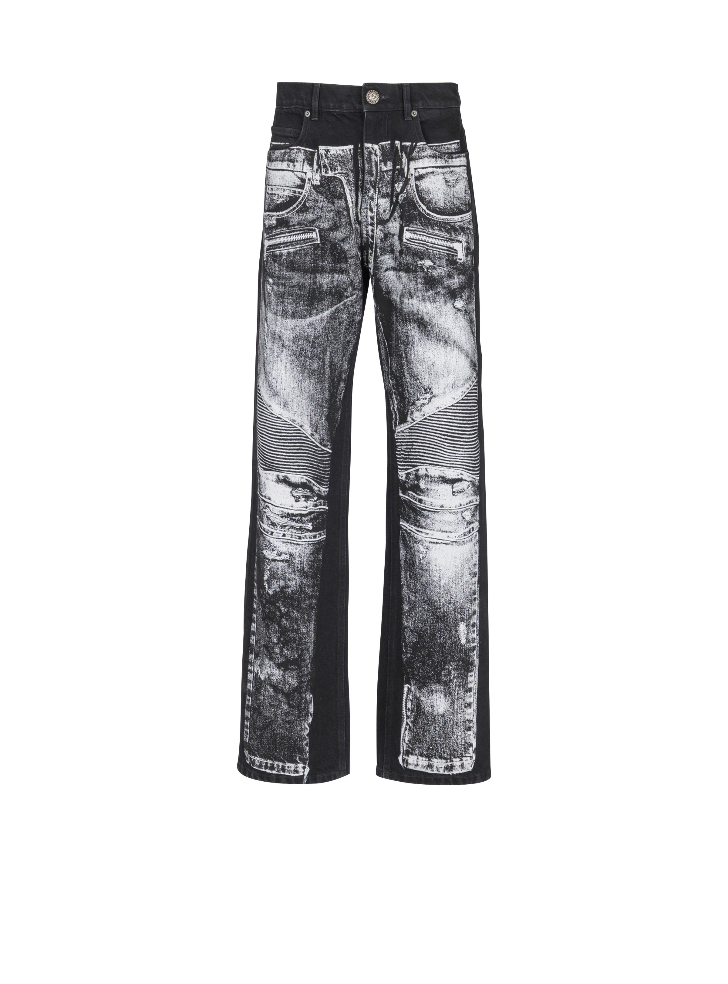 Denim jeans with a biker print - Waistband with belt loops and a triple belt loop at the back - Zip fastening with a metal "Double Chain Lion" button - 5 classic pockets - Woven vintage Balmain label - Engraved rivets - Silver hardware - Loose fit - Model measures 187cm and wears a size 30 - Main material: 100% cotton - Made in Italy - Item: EH1ML155DF52