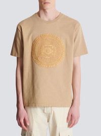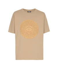 Embroidered Balmain Medaille T-shirt - Round neck with ribbed trim - Short sleeves - Tone-on-tone Balmain Medaille embroidery on the front - Regular fit - Model measures 190cm and wears a size M - Main material: 100% cotton - Made in Portugal - Item: FH1EG000BD08100% of the cotton fibres used to make this garment are certified and organically farmed