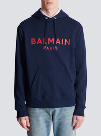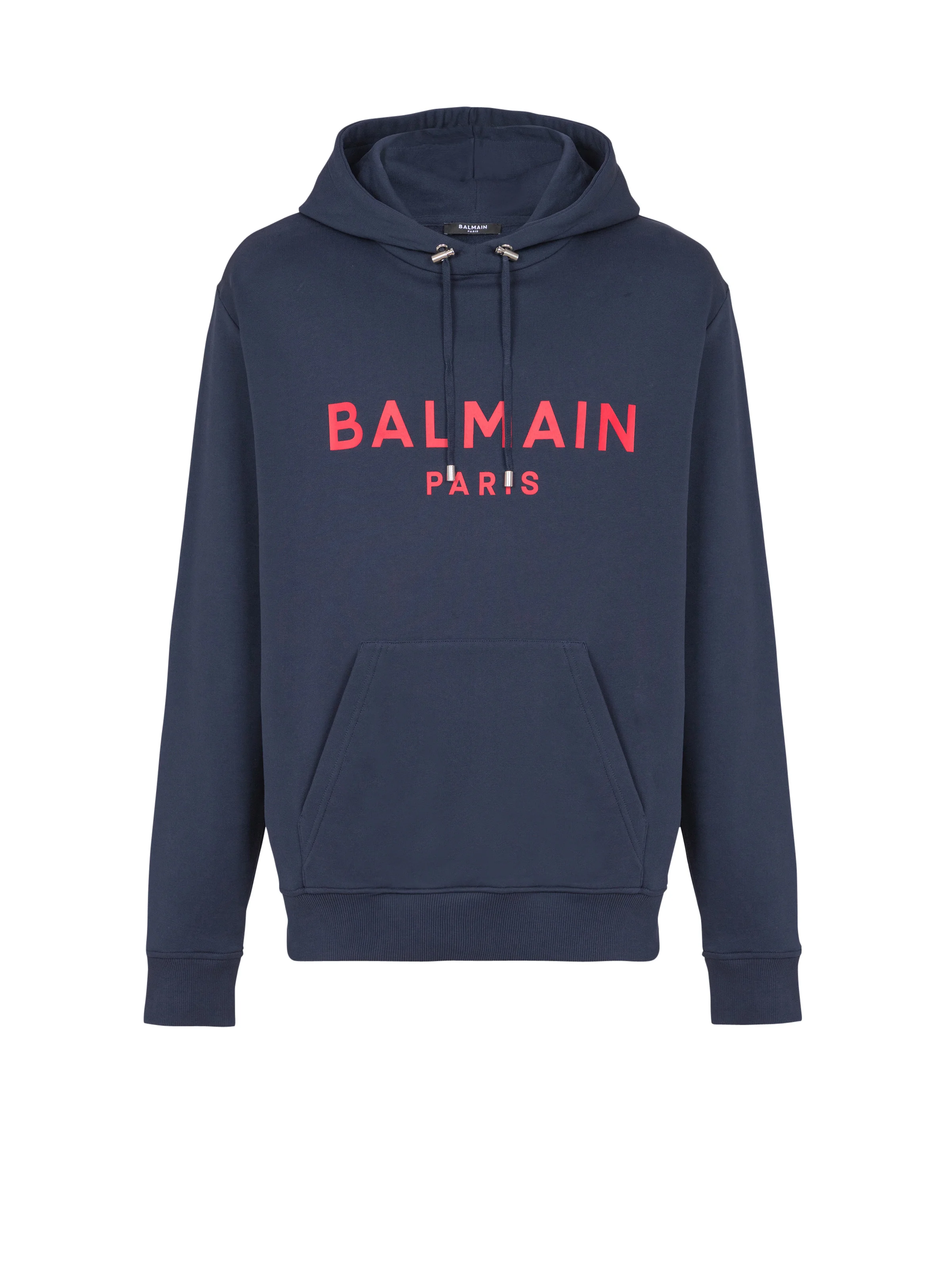 Printed Balmain Paris hoodie - Relaxed fit - Round neck - Drawstring-adjustable hood - Long sleeves - Contrasting Balmain Paris logo printed on the front - Kangaroo pocket - Engraved silver aglets, eyelets and stoppers - Ribbed edging - Model measures 190 cm and wears a size M - Main material: 100% cotton - Made in Portugal - Item: DH1JR002BB65100% of the cotton fibres used to make this garment are certified and organically farmed