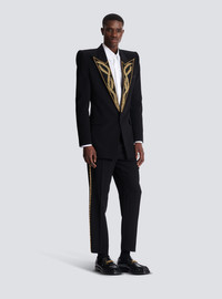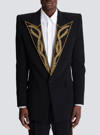 Crepe 1-button jacket with Leaves pattern embroidery - Embroidered Italian tailored collar with Leaves pattern - Crystal and bead embroidery - Structured shoulders - Long sleeves - Straight cuffs with 3 satin-covered buttons - Breast pocket - 2 side slash pockets with flaps - Fastening with 1 satin-covered button - 2 slash inside pockets with buttons - Satin lining - Straight cut with fitted waist - Model measures 190cm and wears a size 48 - Main material: 100% viscose - Made in India - Item: FH1SE286PD09100% of the viscose fibres used to make this garment come from certified, sustainably managed forests