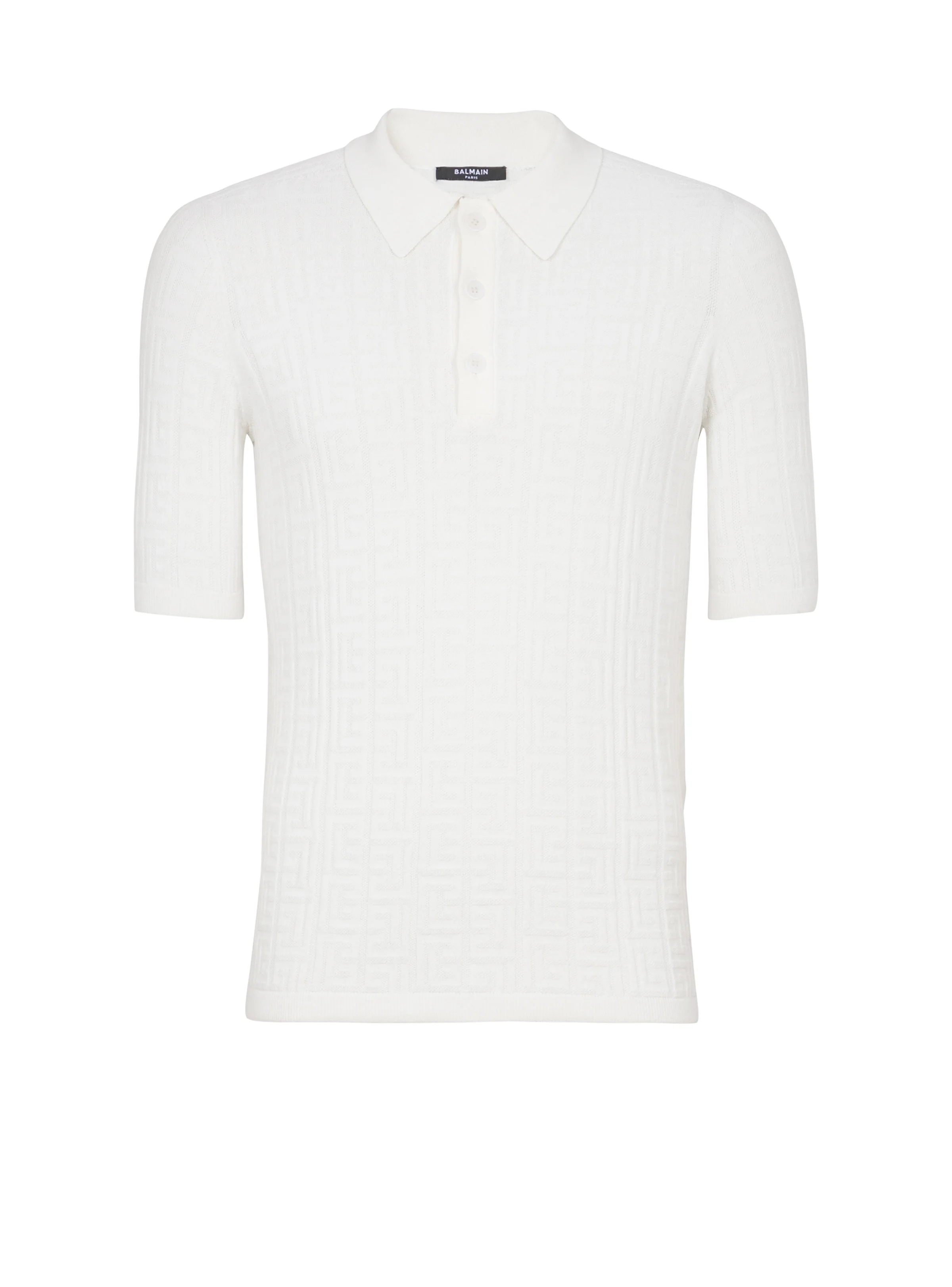 PB Labyrinth knit polo shirt - Ribbed polo collar - Fastening with 3 Balmain-engraved buttons - Short sleeves - Ribbed trim - Fitted cut - Model measures 190cm and wears a size M - Main material: 67% viscose 33% polyester - Made in Italy - Item: FH1GB067KI63100% of the viscose fibres used to make this garment come from certified, sustainably managed forests
