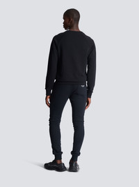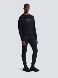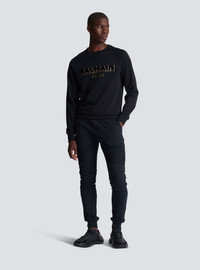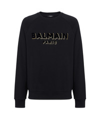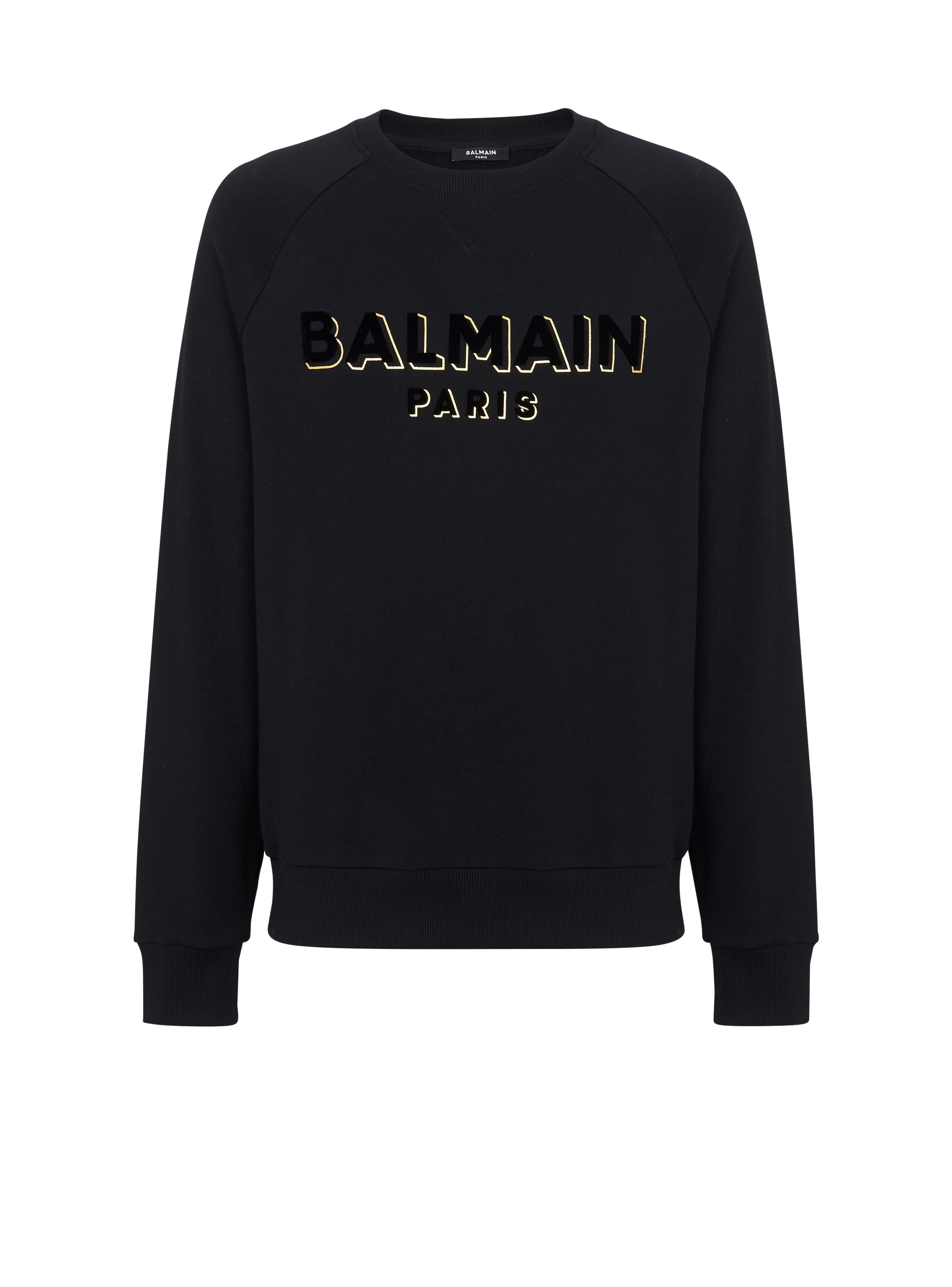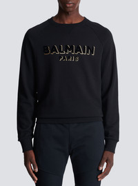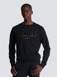 Flocked Balmain sweatshirt - Two-tone metallic, flocked Balmain logo on front - Straight cut - Round neck - Long sleeves - Ribbed trim - Model measures 187cm and wears a size M - Main material: 100% cotton - Made in Portugal - Item: CH1JQ005BB99100% of the cotton fibres used to make this garment are organically farmed and GOTS-certified