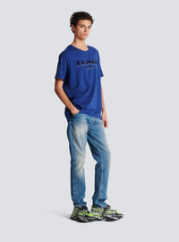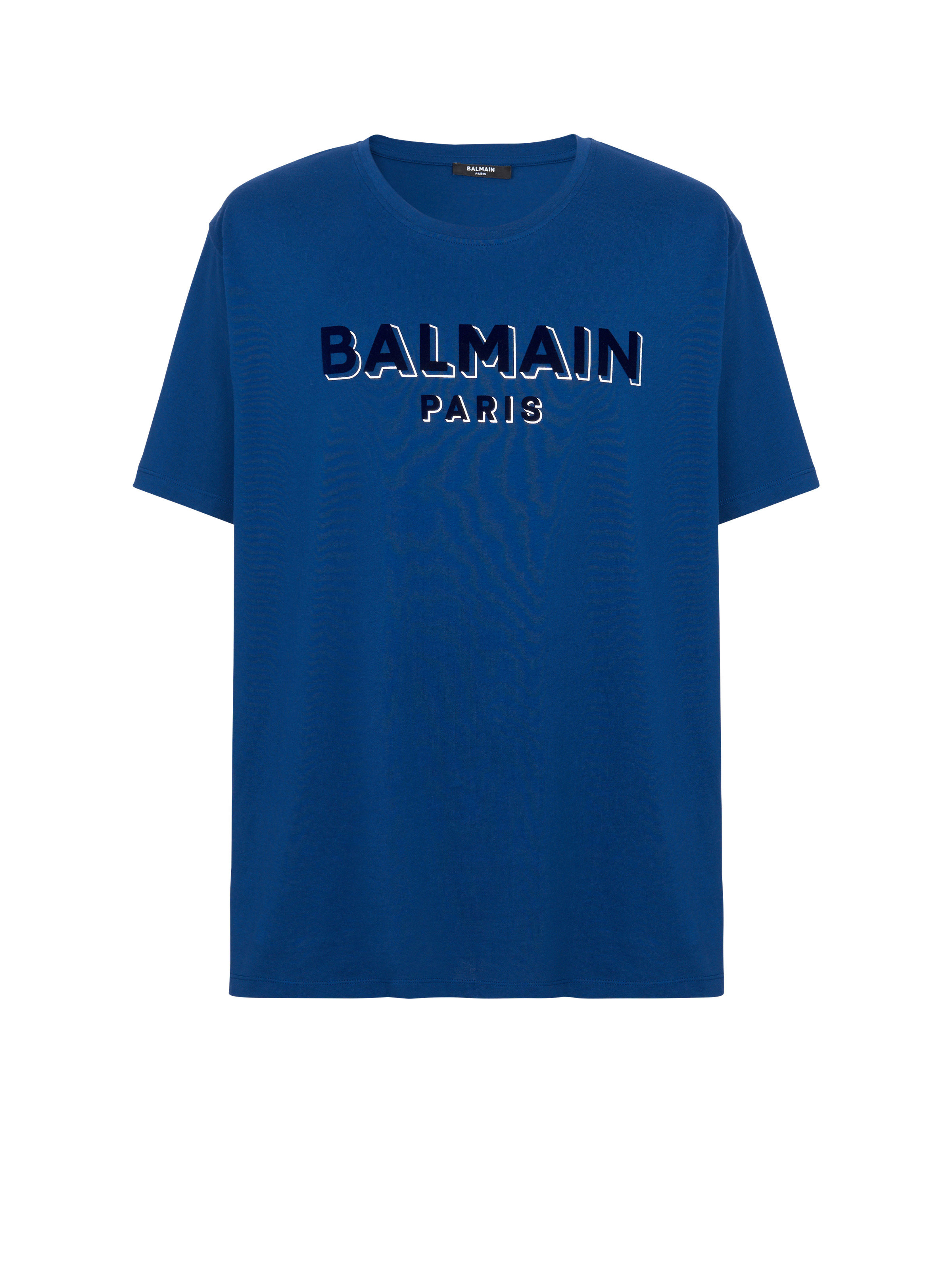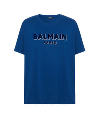 Flocked Balmain T-shirt - Two-tone metallic, flocked Balmain logo on front - Relaxed fit - Round neck - Short sleeves - Model measures 189cm and wears a size M - Main material: 100% organic cotton - Made in Portugal - Item: CH1EG010BB99100% of the cotton fibres used to make this garment are organically farmed and GOTS-certified
