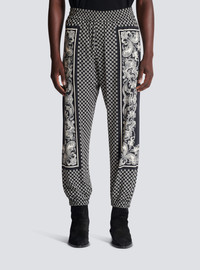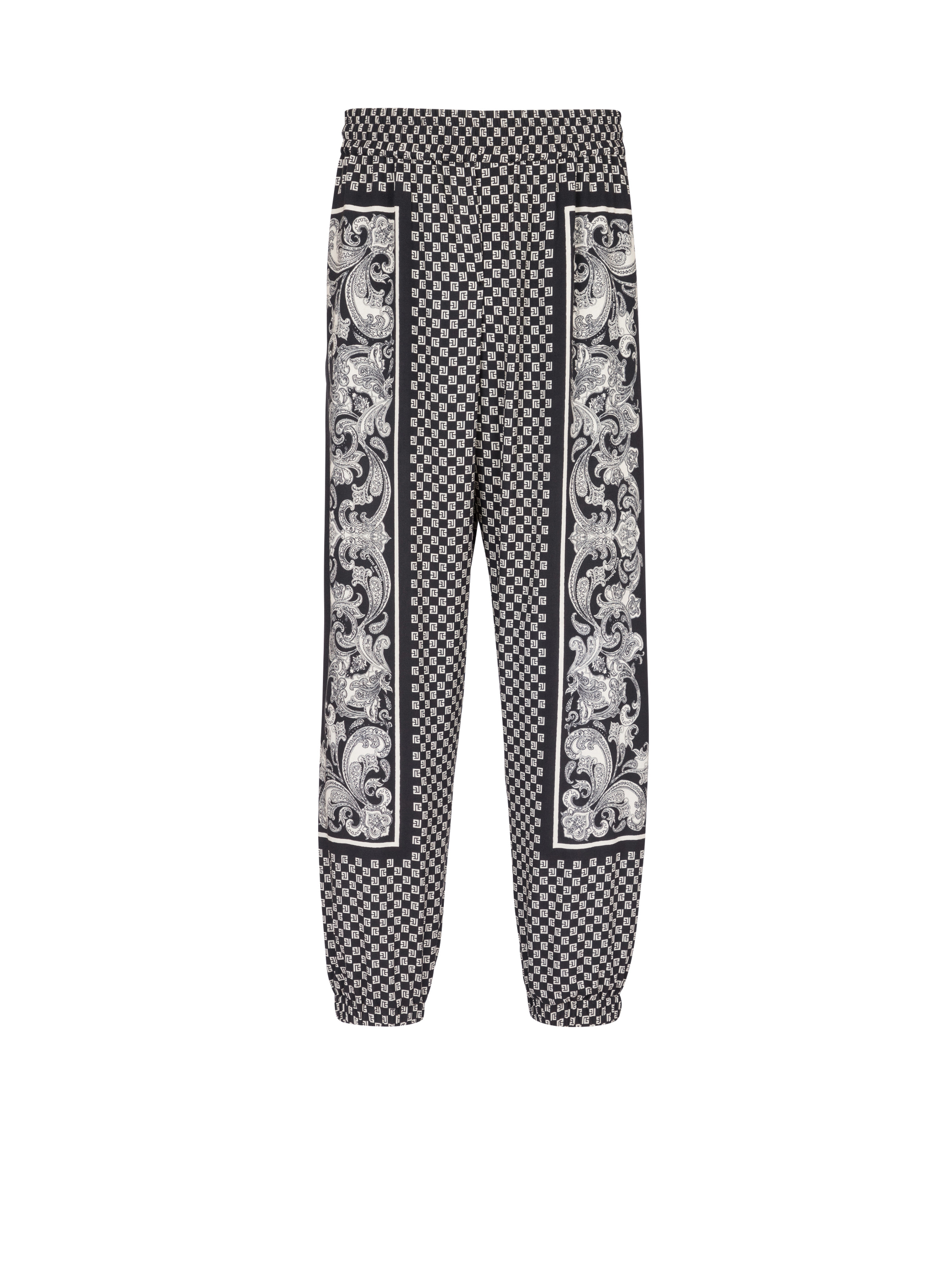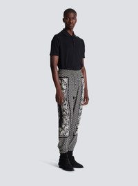 Mini monogram and paisley print casual trousers - Pierre Balmain close-up logo block print - Loose-fit straight-leg cut - Adjustable elasticated waist - 2 slanted pockets, gathered ankles - Model measures 187cm and wears a size 48 - Main material: 100% viscose - Made in Italy - Item: CH1PO092VE27100% of the viscose fibres used to make this garment come from responsibly managed and FSC®-certified forests