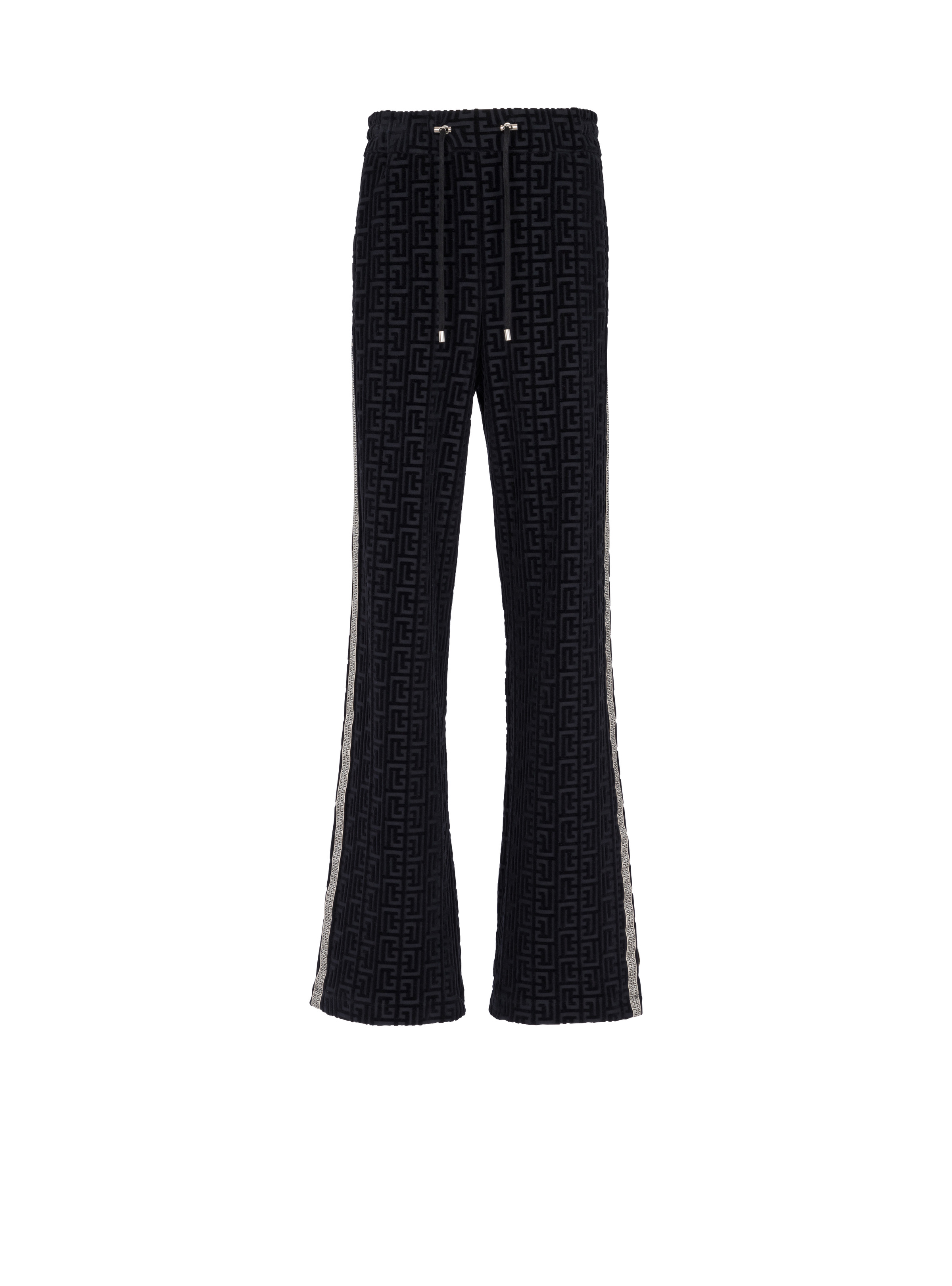 Monogrammed velvet jogging bottoms - Relaxed fit - Drawstring-adjustable waist - Silver metal eyelets, stoppers and aglets - Contrasting stripes down the legs - Ribbed trim - Model measures 187cm and wears a size M - Material: 84% polyester, 16% elastane - Made in Portugal - Item: BH1PQ265JG41