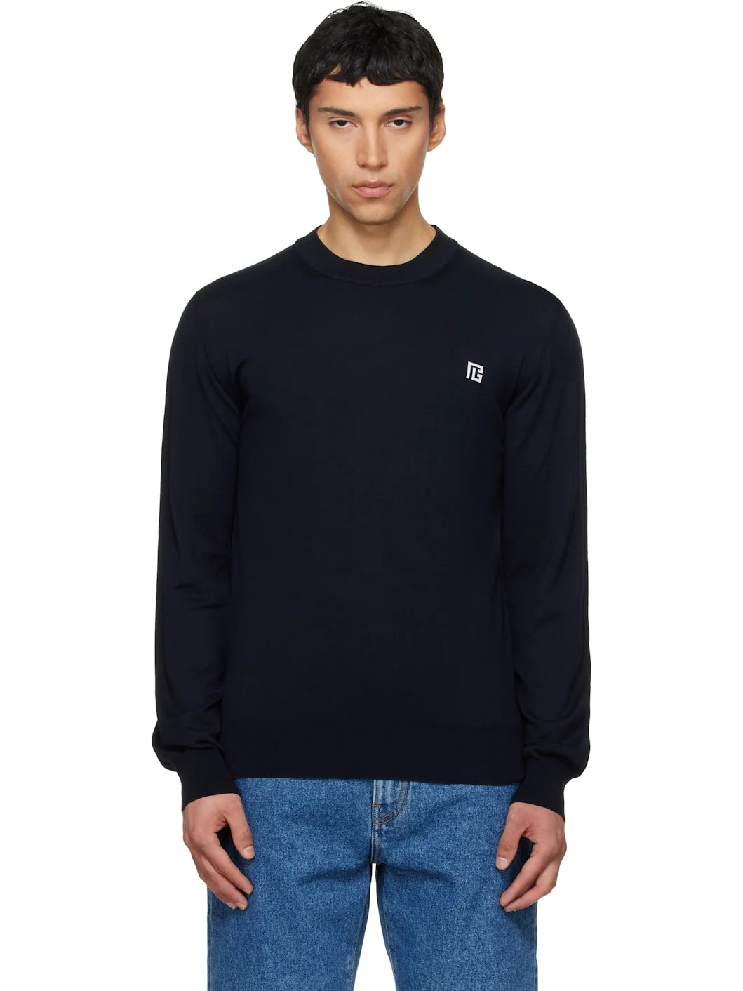 Knit stretch silk- and cotton-blend sweater. · Rib-knit crewneck, hem, and cuffs · Jacquard logo at chest Supplier color: Marine/Blanc Body: 54% silk, 44% cotton, 1% elastane, 1% polyamide. Trim: 55% silk, 45% cotton. Made in Italy 261251M201010