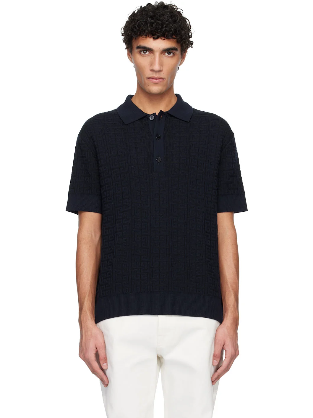 Knit wool- and linen-blend polo. · Knit logo pattern throughout · Rib-knit spread collar, hem, and cuffs · Three-button placket Supplier color: Bleu Marine 68% wool, 30% linen. Made in France 261251M212005