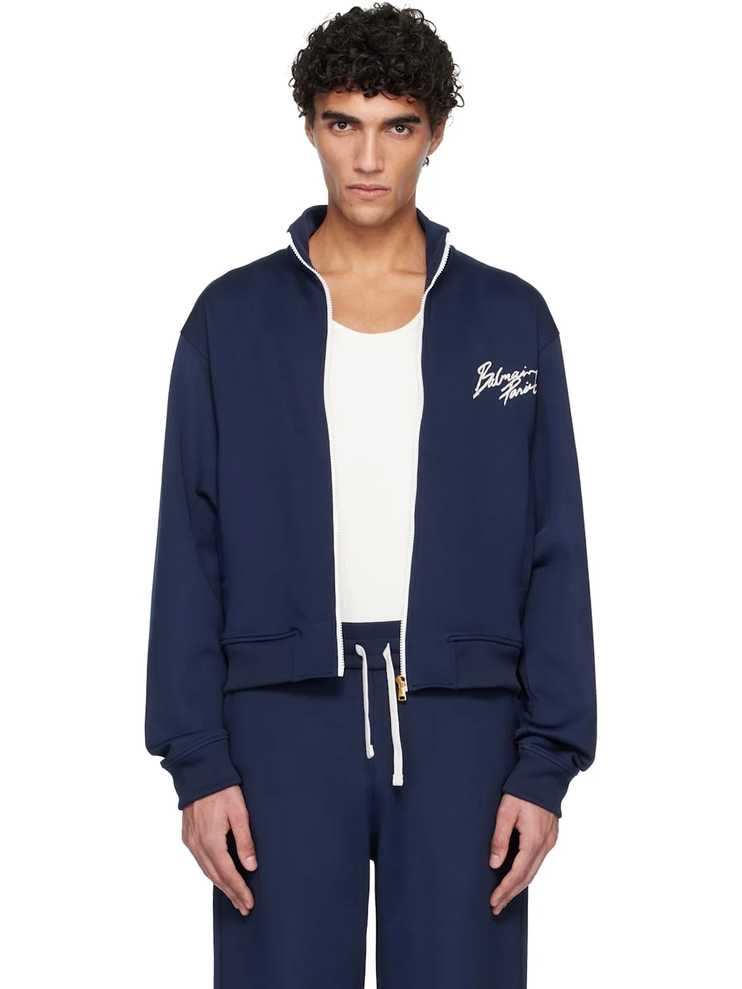 Stretch double-faced jersey track jacket. · Funnel neck · Two-way zip closure · Logo printed at chest · Welt pockets at waist · Rib-knit hem and cuffs · Unlined Supplier color: Marine/Blanc 73% polyester, 25% viscose, 2% elastane. Made in Portugal 261251M202001
