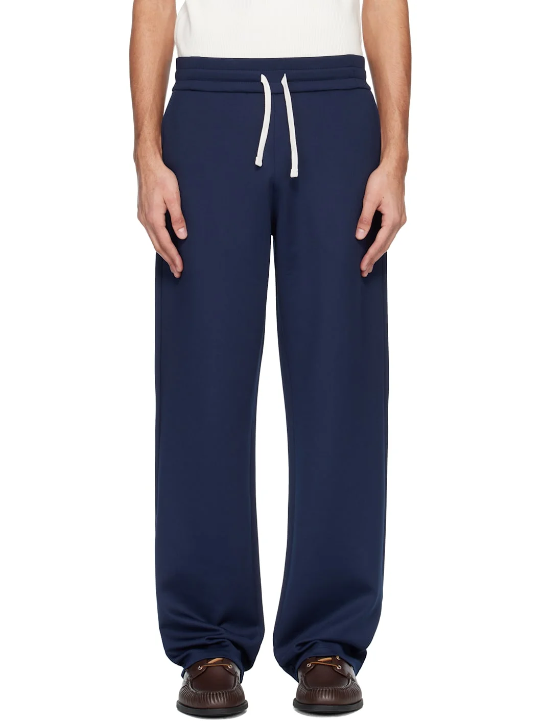 Stretch double-face jersey sweatpants. · Straight-leg · Drawstring at elasticized waistband · Four-pocket styling · Logo printed at back pocket Supplier color: Marine/Blanc Body: 75% polyester, 25% viscose, 2% elastane. Lining: 100% cotton. Made in Portugal 261251M202000