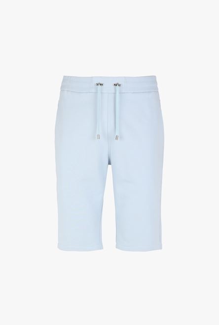 Pale blue eco-designed cotton shorts with flocked white Balmain Paris logo
