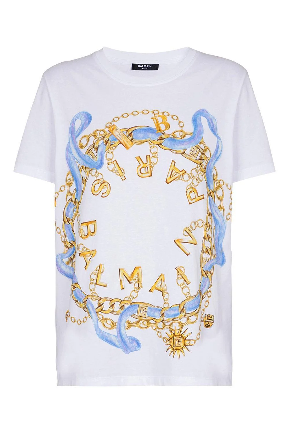DETAILS AND INSIGHT Balmain paris chains t-shirt in blanc / bleu. 100% Cotton Dry Clean Made In Italy Style FF1EF000GF09-GWJ