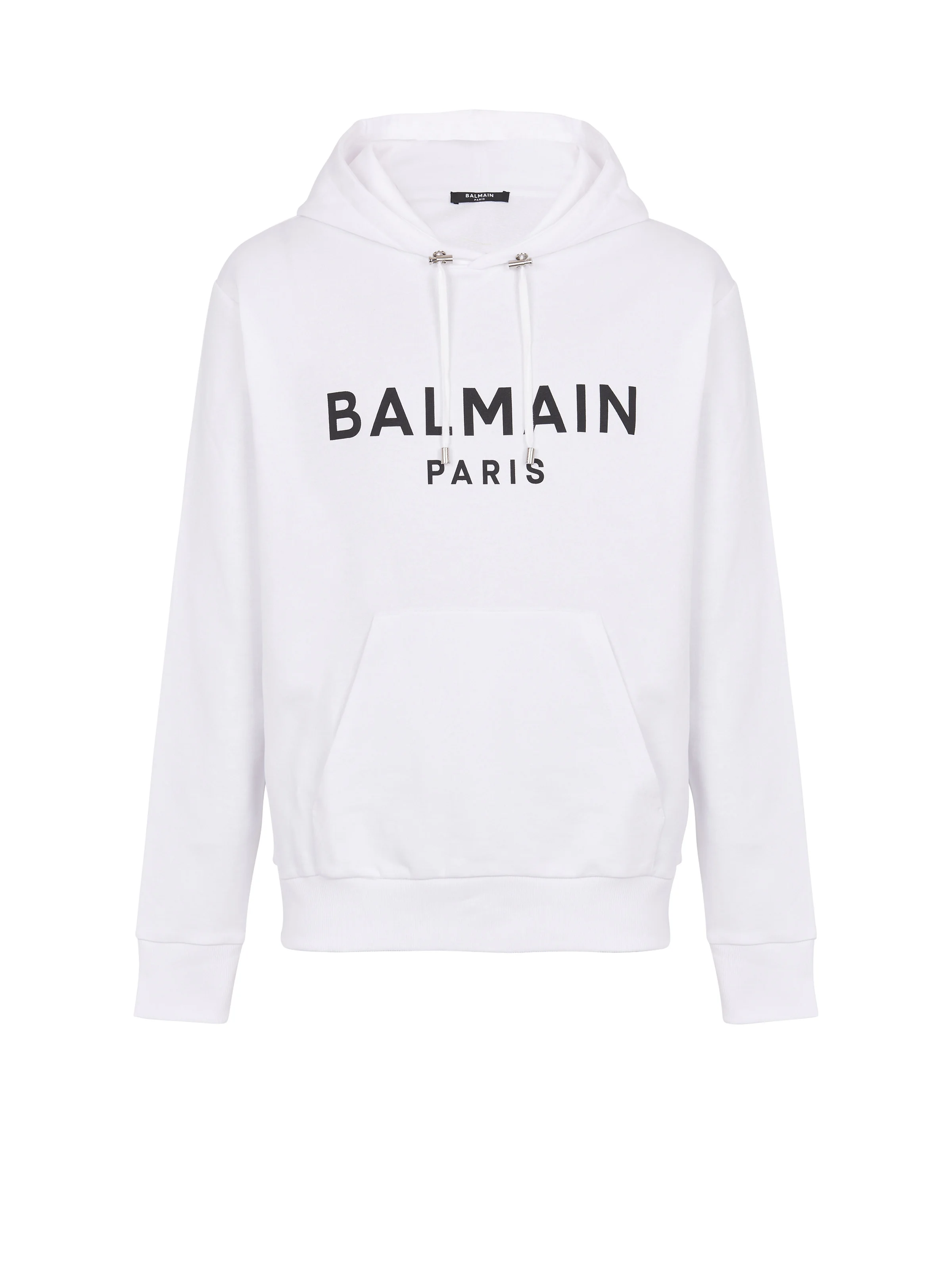 Printed Balmain Paris hoodie - Relaxed fit - Round neck - Drawstring-adjustable hood - Long sleeves - Contrasting Balmain Paris logo printed on the front - Kangaroo pocket - Engraved silver aglets, eyelets and stoppers - Ribbed edging - Model measures 190 cm and wears a size M - Main material: 100% cotton - Made in Portugal - Item: DH1JR002BB65100% of the cotton fibres used to make this garment are certified and organically farmed