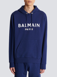 Balmain Paris hooded sweatshirt - Contrasting printed logo on the front - Straight cut - Round neckline - Drawstring-adjustable hood - Silver metal eyelets, stoppers and aglets - Ribbed trim - Model measures 189 cm and wears a size M - Material: 100% certified organic cotton - Made in Portugal - Item: BH1JR002BB65 100% of the cotton fibres used to make this garment are organically farmed and GOTS-certified