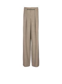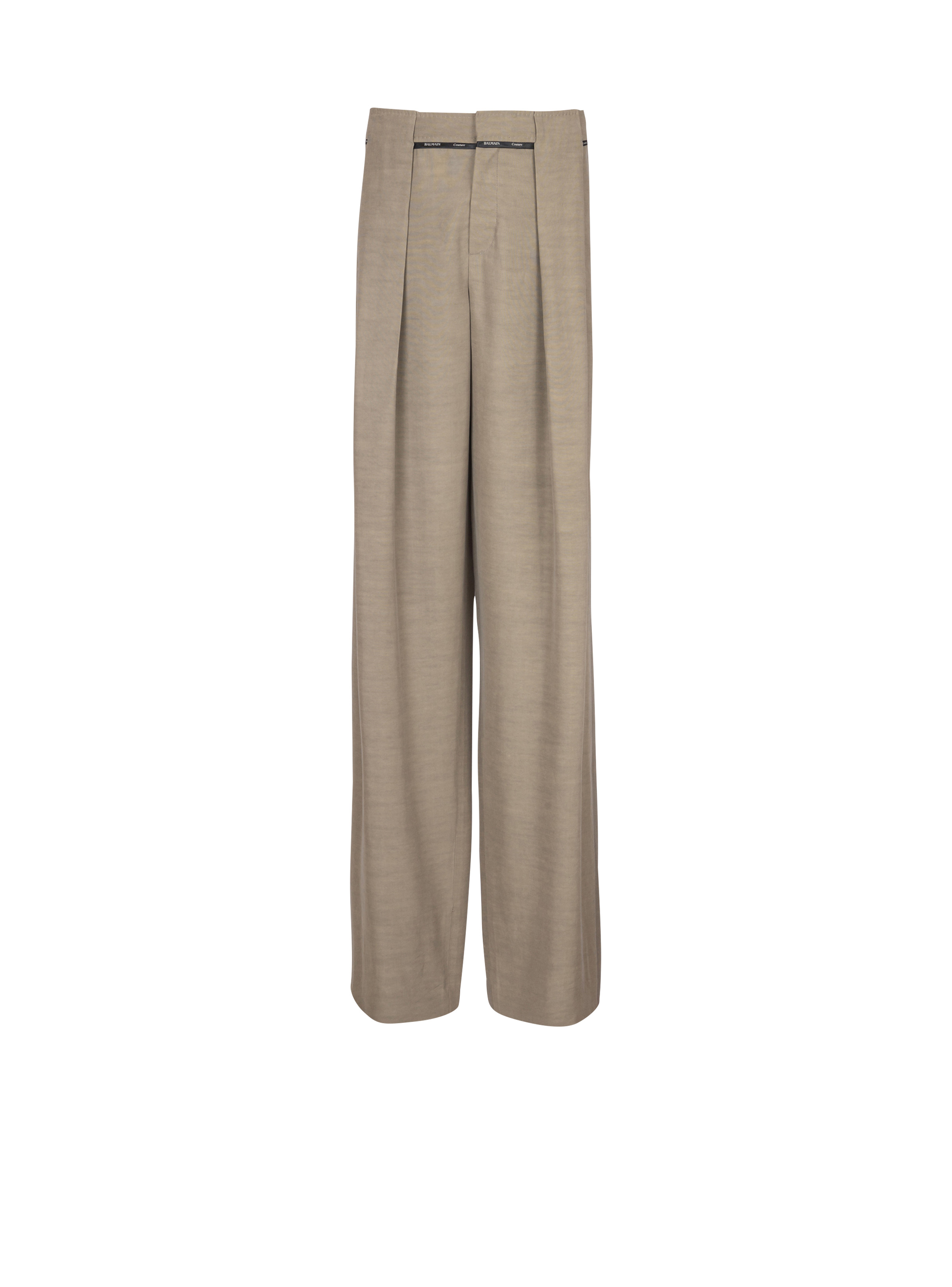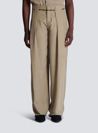 Pleated plain cupro trousers - Waistband with belt loops and a triple belt loop at the back - Front pleats with belt loops - Contrasting Balmain Couture ribbon at the waist - Finished with visible stitching on the waistband - Zip and hook fastening under a placket - 2 slash side pockets - 2 slash back pockets with flaps - Loose fit and regular waist - Model measures 187cm and wears a size 48 - Main material: 50% cupro 50% viscose - Made in Italy - Item: EH1PQ315VH50