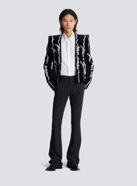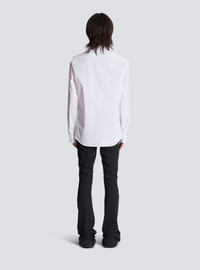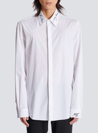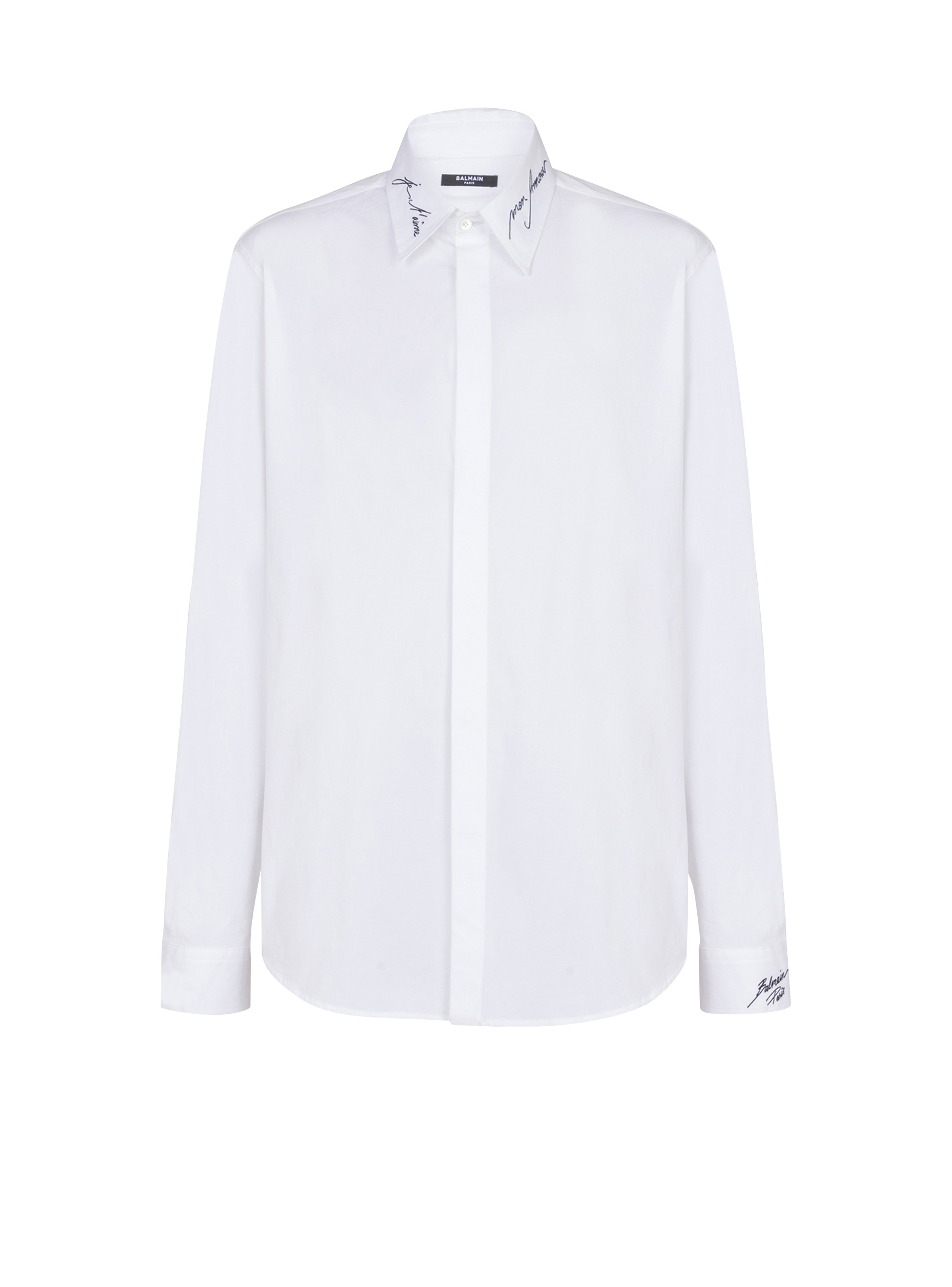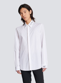 Poplin shirt with embroidered collar - Shirt collar with "Love Letter" embroidery - Long sleeves - Straight cuffs with 2 engraved buttons - Balmain Letter logo embroidered on the cuff - Fastening with 7 engraved buttons (6 under the placket) - Straight cut - Model measures 186cm and wears a size 39 - Main material: 100% cotton - Made in Italy - Item: EH1HS409CF43