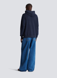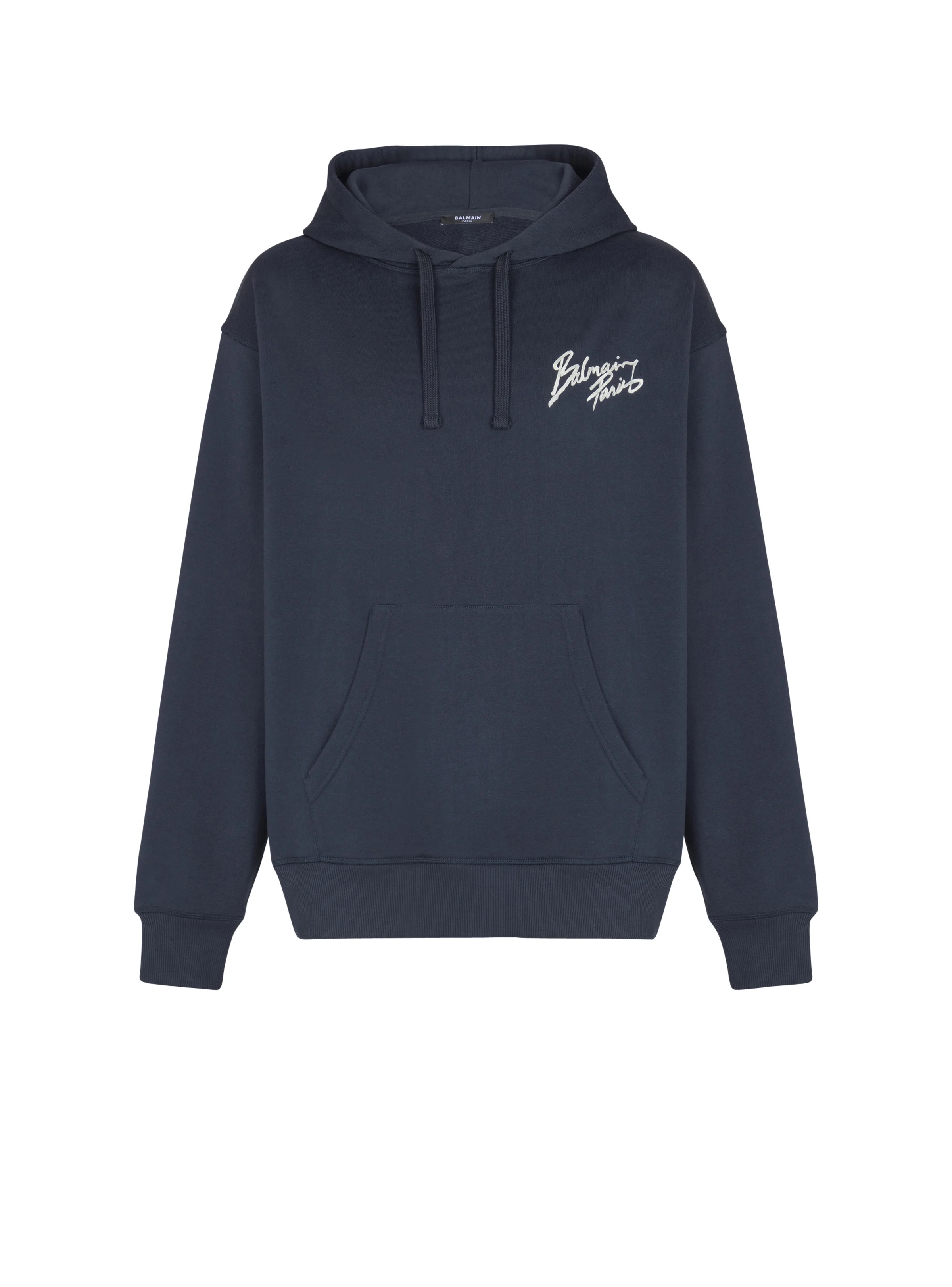Hoodie with drawstring hood - Long sleeves - Adjustable hood with drawstring - Front kangaroo pocket - Balmain Paris Brush print on the chest - Ribbed edging - Regular fit - Model measures 190cm and wears a size M - Main material: 100% cotton - Made in Portugal - Item: GH1JR007BD40100% of the cotton fibres used to make this garment are certified and organically farmed