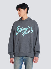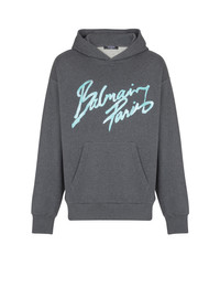 Cotton jersey hoodie - Long sleeves - Adjustable hood with drawstring - Balmain Attitude print on the front - Relaxed fit - Model measures 187cm and wears a size M - Main material: 100% cotton - Made in Italy - Item: GH1JT252BD43100% of the cotton fibres used to make this garment are certified and organically farmed