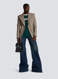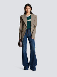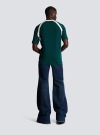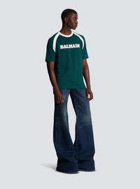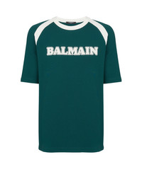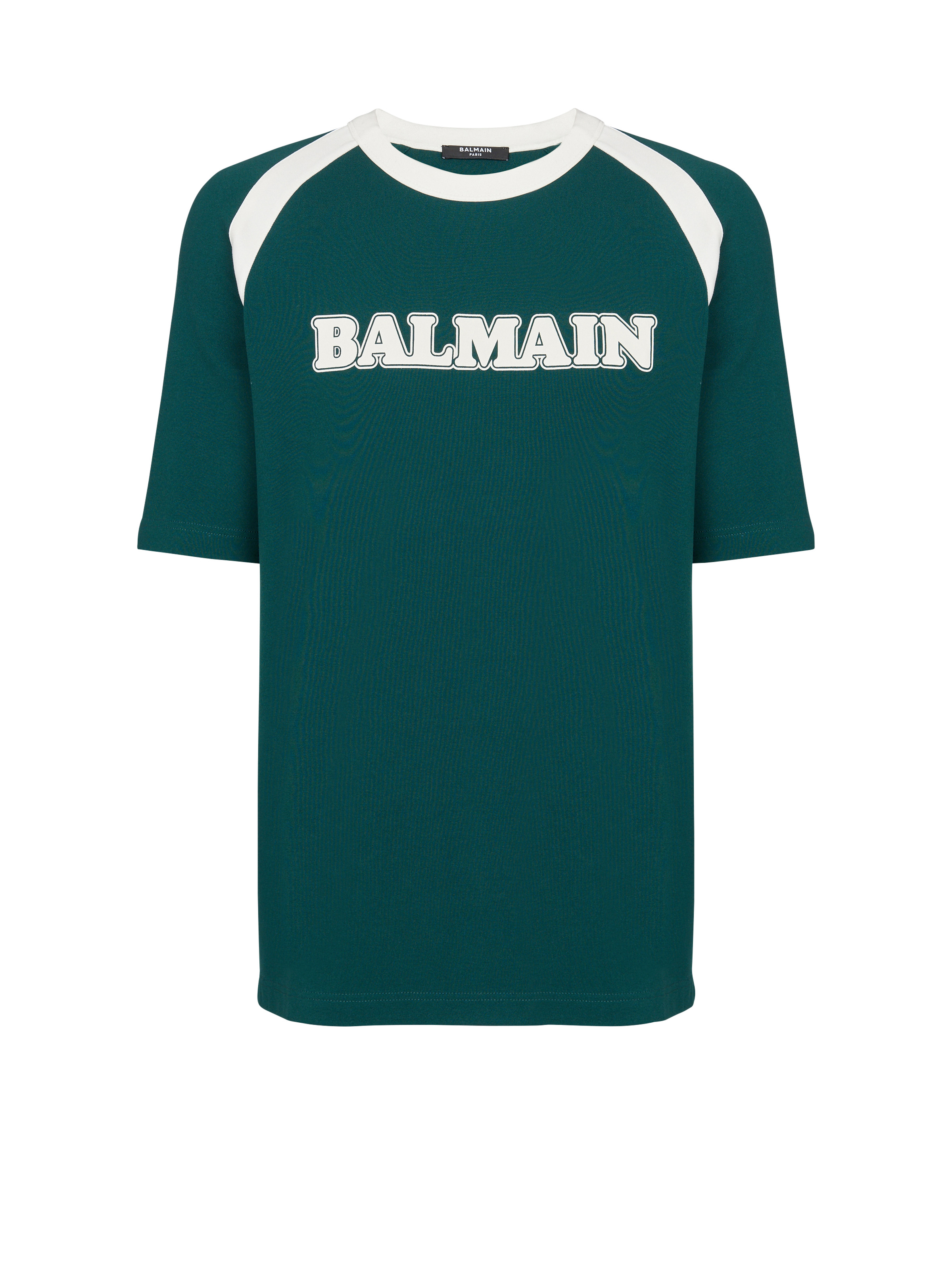 Balmain retro unisex T-shirt - Contrasting, retro printed Balmain logo on the front - Round neckline - Straight cut - Short sleeves - Contrasting shoulder and neck inserts - Model measures 187 cm and wears a size M - Material: 63% ecovero viscose, 31% polyamide, 6% elastane - Made in Portugal - Item: BU1EF075BC45 100% of the viscose fibres used to make this garment come from responsibly managed and LENZING™- and ECOVERO™-certified forests