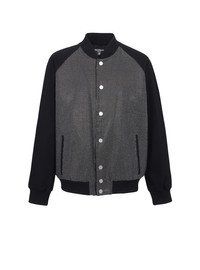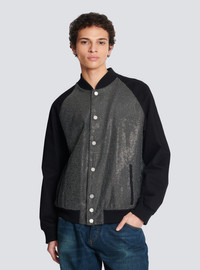 Denim bomber - Front fully decorated with crystals - Contrasting plain denim sleeves - Balmain logo in rhinestones on the back - Front fastening, 7 Balmain-engraved snaps in silver metal - 2 welt pockets with contrasting edges - Ribbed cuffs, waist and collar - Model measures 189cm and wears a size 48 - Main material: 100% cotton - Made in Italy - Item: BH0TF294DD76