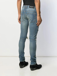 slim-fit ripped jeans Let Balmain solve your wardrobe worries. These faded blue slim-fit biker jeans boast ripped details and a distressed finish. Get that rough and tough look. Featuring a mid rise, belt loops, a concealed zip fastening, a five pocket design, front zipped pockets, a branded rear patch and ribbed knee panels. Imported Composition Outer: Cotton 98%, Polyurethane 2% Lining: Cotton 100% SIZE & FIT Model measurements Height 6 ft 2 in(1.87 m) Bust/Chest 38.18 in(97 cm) Hips 36.61 in(93 cm) Waist 29.13 in(74 cm) Measurement FRONT RISE 10.82 in(27.5 cm) INSIDE LEG 33.46 in(85 cm) BACK RISE 14.17 in(36 cm) Hem Width 3.34 in(8.5 cm) HIPS 39.37 in(100 cm) WAIST 36.22 in(92 cm) FittingInformation This piece fits true to size. We recommend you get your regular size Cut for a slim fit Made with a mid-weight stretch fabric Washing instructions Hand Wash