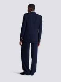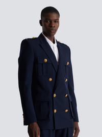 Saharienne blazer jacket - Italian tailored collar - Structured shoulders - Long sleeves - Straight cuffs with 3 "Double Chain Lion" buttons in gold metal - 2 breast pockets with golden buttons - 2 patch side pockets - Double-breasted fastening with 6 matching covered buttons - Straight cut - Model measures 187cm and wears a size 48 - Main material: 100% virgin wool - Made in Slovakia - Item: EH1SI775WC09