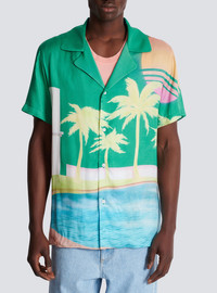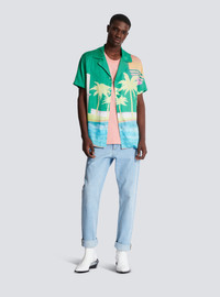 Short-sleeved twill pyjama shirt with palm tree print - Relaxed fit - Shirt collar - Contrasting Balmain Signature embroidery on the back - Fastening with 4 engraved buttons - Model measures 190cm and wears a size 48 - Main material: 100% viscose - Made in Italy - Item: DH1HN067VF35100% of the viscose fibres used to make this garment come from certified, sustainably managed forests