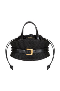 DETAILS AND INSIGHT Balmain shuffle mini bag in noir. Drawstring Closure, Removable Crossbody Fits Iphone Pro Max 100% Polypropylene (Raffia); Lining: 50% Polyurethane 50% Polyester 10 x 23 x 13cm Made In Italy Pre-Order Ships by March 7 Style GN1DP017TFRF-0PA