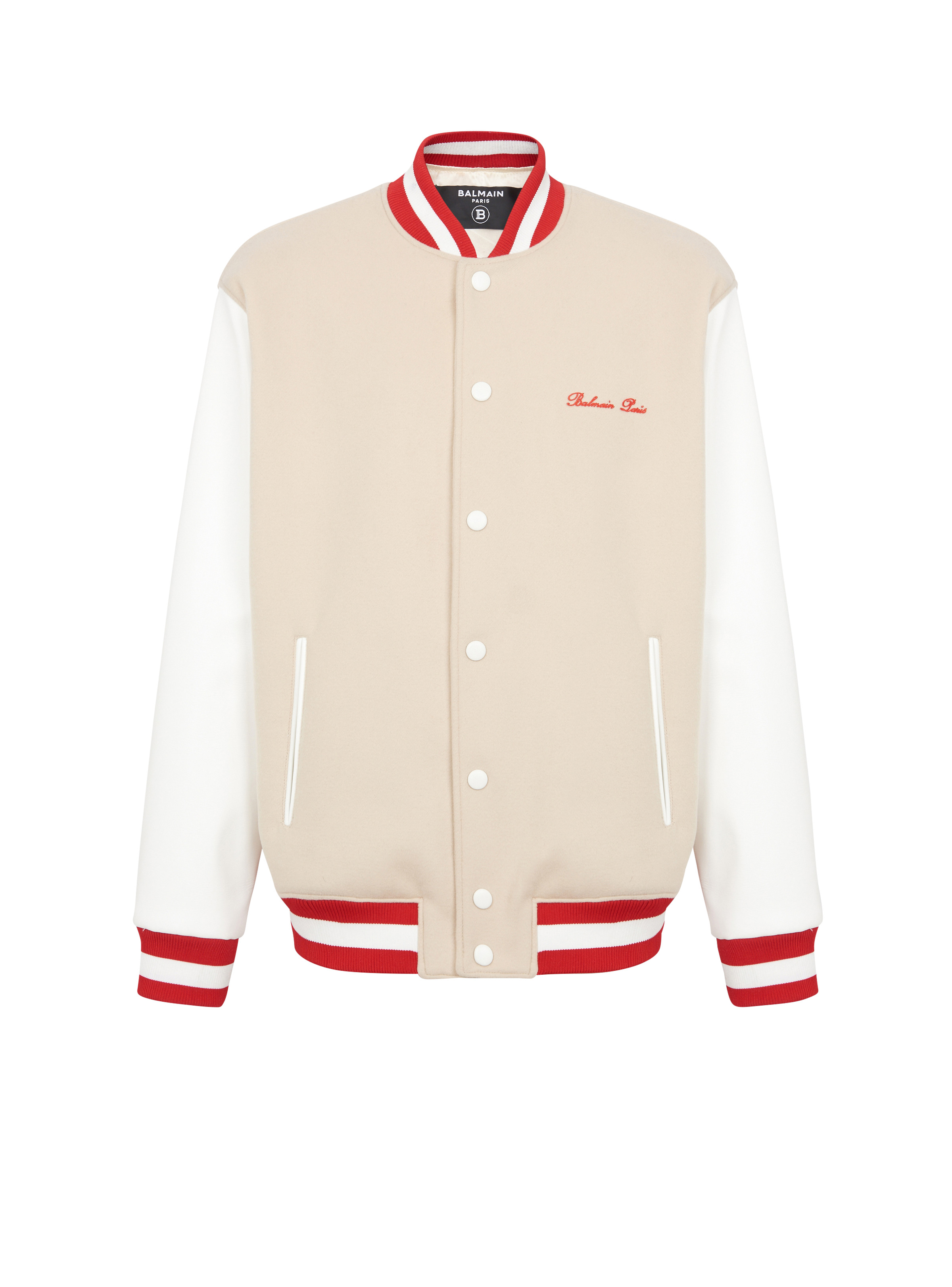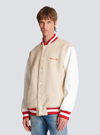 Balmain Signature faux leather and wool bomber jacket - Contrasting Balmain Signature logo embroidered on the front and back - Relaxed fit - Long sleeves - Fastening with contrasting press-studs - 2 slanted pockets with contrasting trim - Ribbed collar, cuffs and waist - Model measures 187cm and wears a size 48 - Main material: 100% virgin wool - Made in Italy - Item: CH1TF610ME53