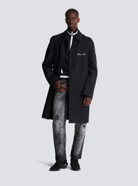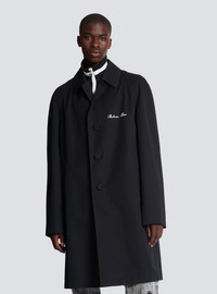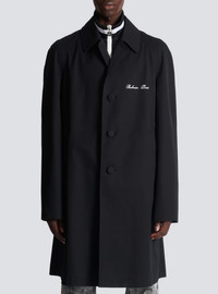 Balmain Signature waterproof coat - Contrasting embroidered Balmain Signature logo - Mid-length oversized cut - Tailored collar - Long sleeves - Fastening with 3 covered buttons - 2 slanted pockets - Model measures 187cm and wears a size 48 - Main material: 59% polyester 28% cotton 13% polyurethane - Made in Italy - Item: CH1UE165XG88