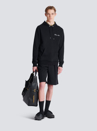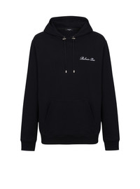 Balmain Signature hoodie - Relaxed fit - Round neck - Drawstring-adjustable hood - Long sleeves - Contrasting Balmain Signature embroidery on the front - Kangaroo pocket - Engraved silver aglets, eyelets and stoppers - Ribbed edging - Model measures 189cm and wears a size M - Main material: 100% cotton - Made in Portugal - Item: DH1JT047BC78100% of the cotton fibres used to make this garment are certified and organically farmed
