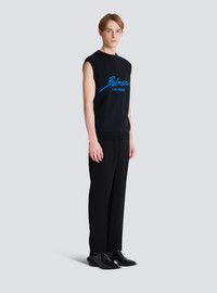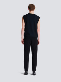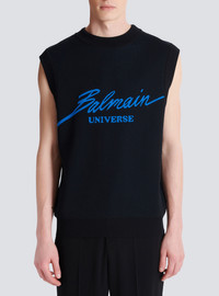 Sleeveless knit jumper with Balmain Universe jacquard - Shifting jacquard - Round neckline - Contrasting Balmain Universe on the front - Ribbed trim - Regular fit - Model measures 188cm and wears a size M - Main material: 52% cotton 48% viscose - Made in Italy - Item: EH0AG004KI29