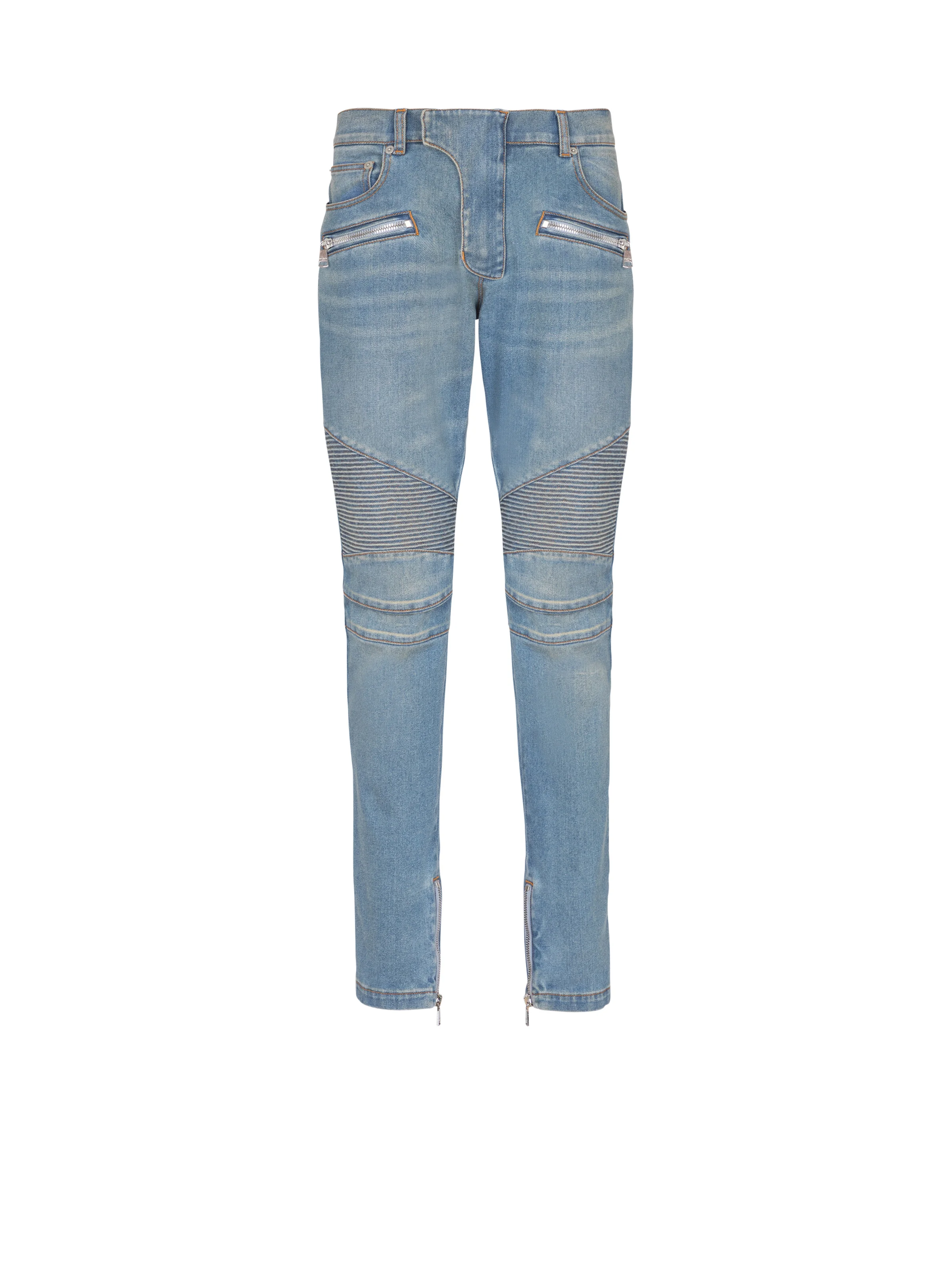 Blue denim biker jeans - Waistband with belt loops and a triple belt loop at the back - Fly - Zip and hook fastening under a placket - 5 classic pockets, including 2 slash pockets on the back - 2 visible zip pockets, Balmain Paris-engraved slider - Ribbed knees - Visible ankle zips - Woven vintage Balmain label - Engraved rivets - Silver hardware - Slim fit - Model measures 190cm and wears a size 30 - Main material: 98% cotton 2% elastane - Made in Italy - Item: FH1MG115DF81