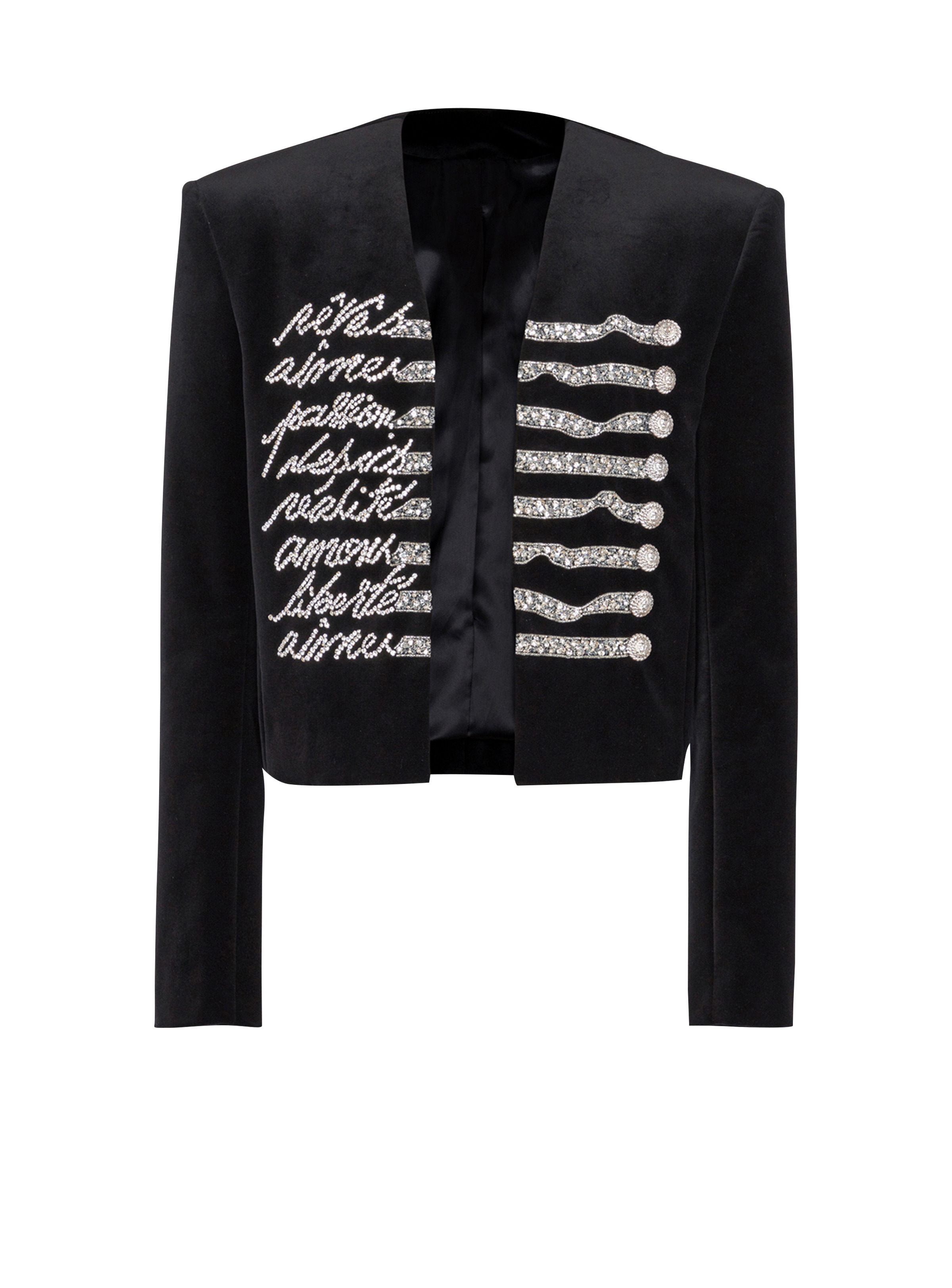 Cropped velvet jacket with "Love Letter" embroidery - Collarless - Structured shoulders - Long sleeves - Straight cuffs with 3 embellished buttons - Crystal, bead and sequin embroidery - Decorative "Double Chain Lion" buttons in silver metal - 2 slash inside pockets with buttons - Satin lining - Straight, cropped fit - Model measures 190cm and wears a size 48 - Main material: 100% cotton - Made in India - Item: EH1SC197PC70