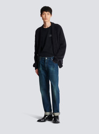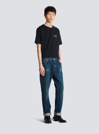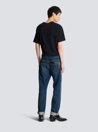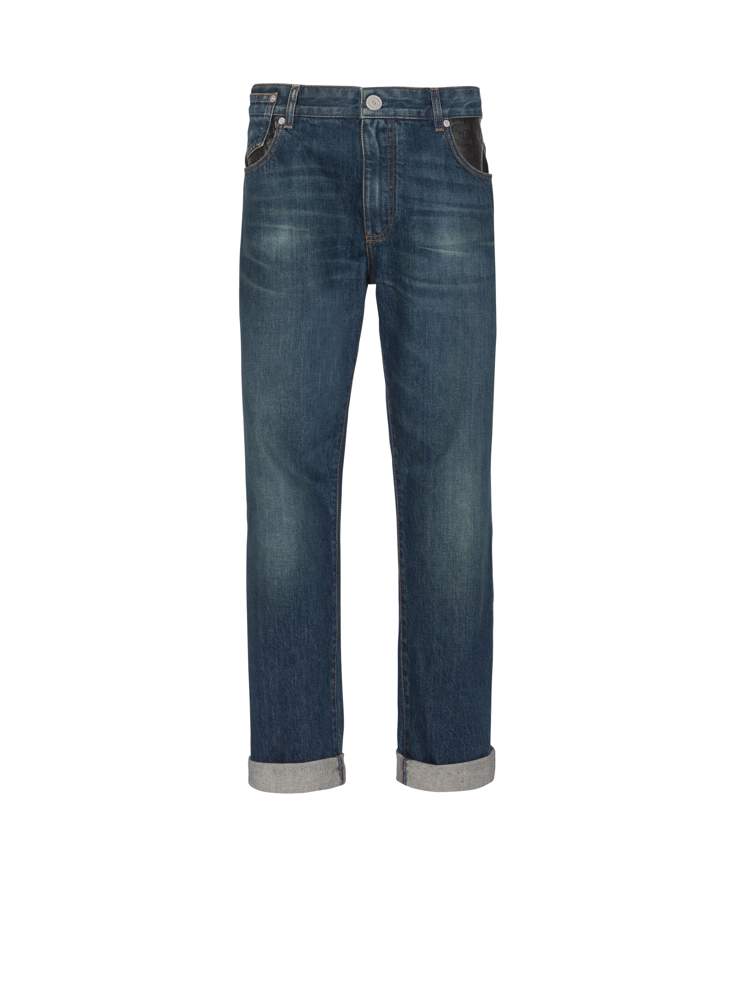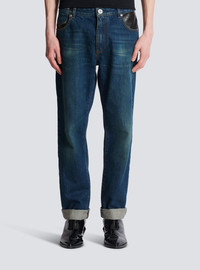 Straight-leg jeans with leather pockets - 5 classic pockets, including 3 in leather with an embossed PB logo - Straight cut - Vintage wash - Metal zip fastening at the front - Triple belt loop on the back - Balmain-engraved silver metal buttons and rivets - Contrasting caramel topstitching - Model measures 189cm and wears a size 30 - Material: 100% cotton - Made in Italy - Item: BH0MI043DD83