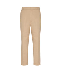 Plain tailored canvas trousers - Waistband with belt loops and a triple belt loop at the back - Zip and hook fastening under a placket - 2 Italian side pockets - Pleats on the front and back - 2 patch pockets on the back with covered buttons - Straight cut - Model measures 190cm and wears a size 48 - Main material: 56% cotton 44% linen - Made in Portugal - Item: FH1PM037CG14