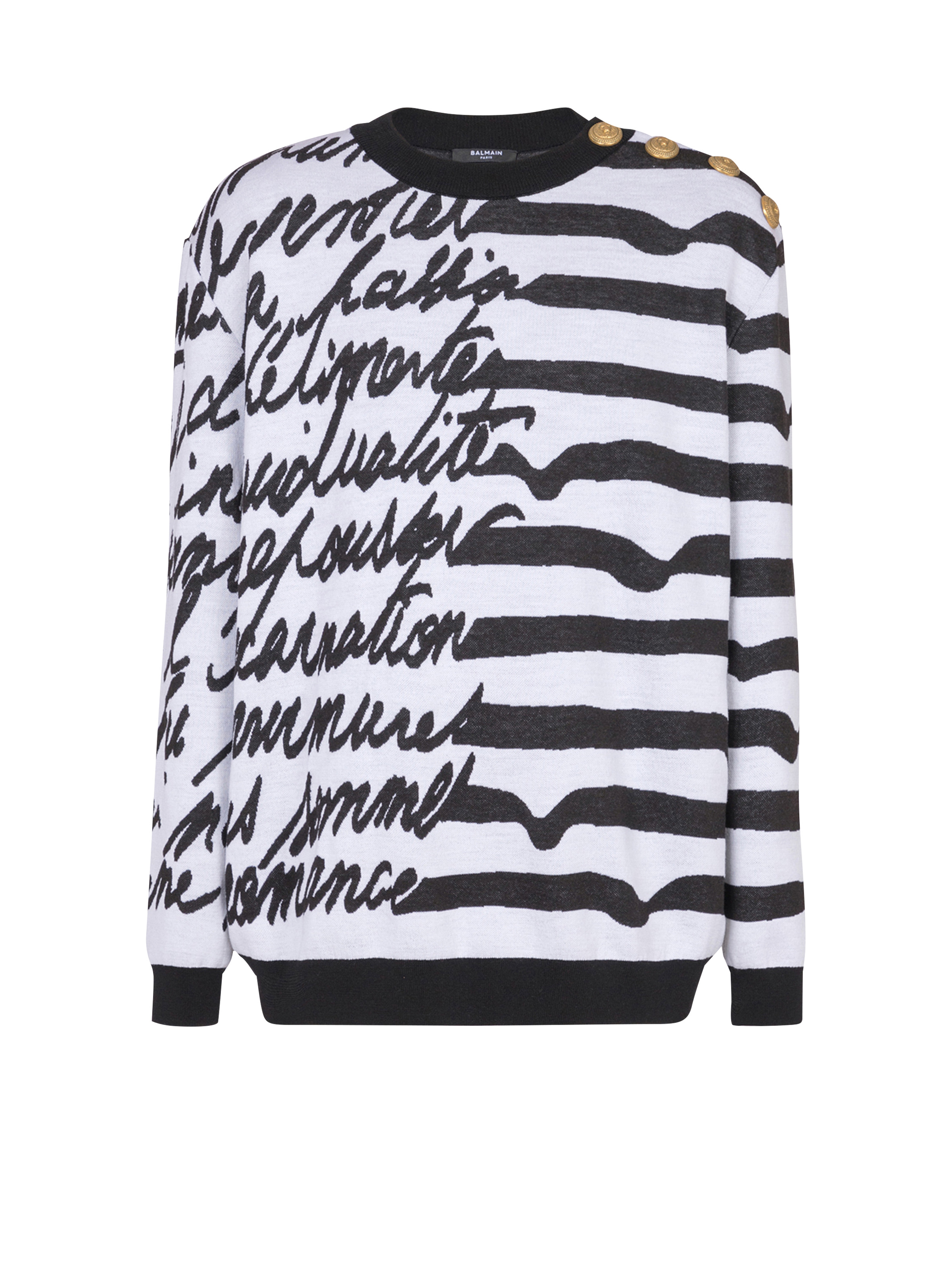 Striped "Love Letter" knit jumper - Round neckline - 3 decorative "Chain Lion" buttons in gold metal on the shoulder - Long sleeves - Contrasting ribbed edging - Relaxed fit - Model measures 187cm and wears a size M - Main material: 66% merino wool 19% cotton 9% polyamide 5% wool 1% elastane - Made in France - Item: EH1KD013KI04