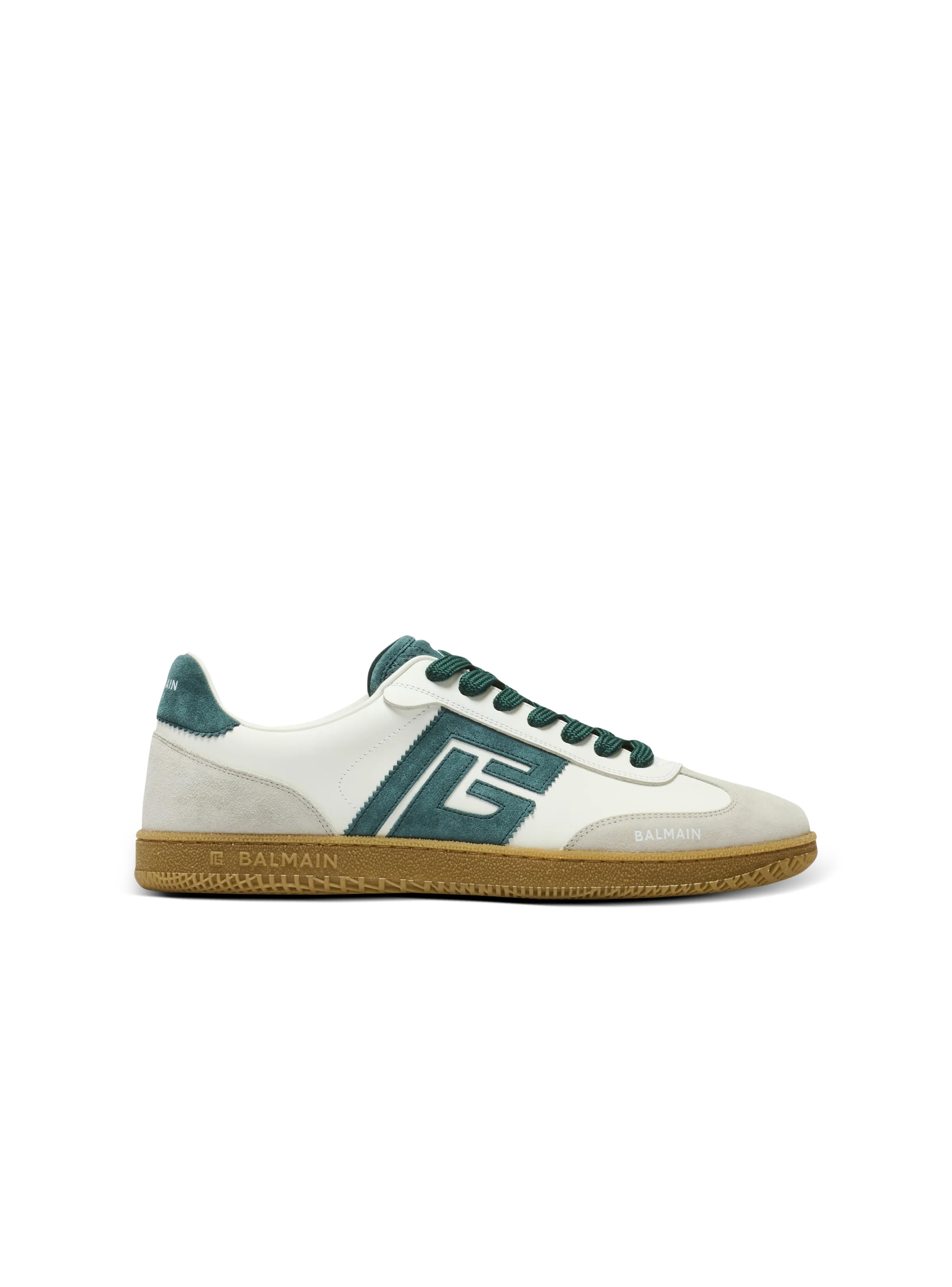 Balmain Swan suede and smooth calfskin leather trainers - Lace fastening - Diamond pattern embossed leather tongue with PB logo - Contrasting PB logo on the sides - Balmain logos embossed on the front and back - Textured rubber outsole with raised Balmain logo - Leather lining and insole - Main material: 100% calfskin - Made in France - Item: FM1VI360LCWE