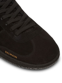 Balmain Swan suede and patent leather sneakers - Multi-material design in suede and patent leather - Lace fastening - Diamond-embossed suede leather tongue with gold PB logo - Patent leather PB logo insert on the side - Gold Balmain logo embossed on the side - Contrasting panel with embossed Balmain Paris logo on the back - Textured rubber outsole with raised Balmain logo - Leather lining and insole - Main material: 100% goatskin - Made in Portugal - Item: EM1VI360LABP