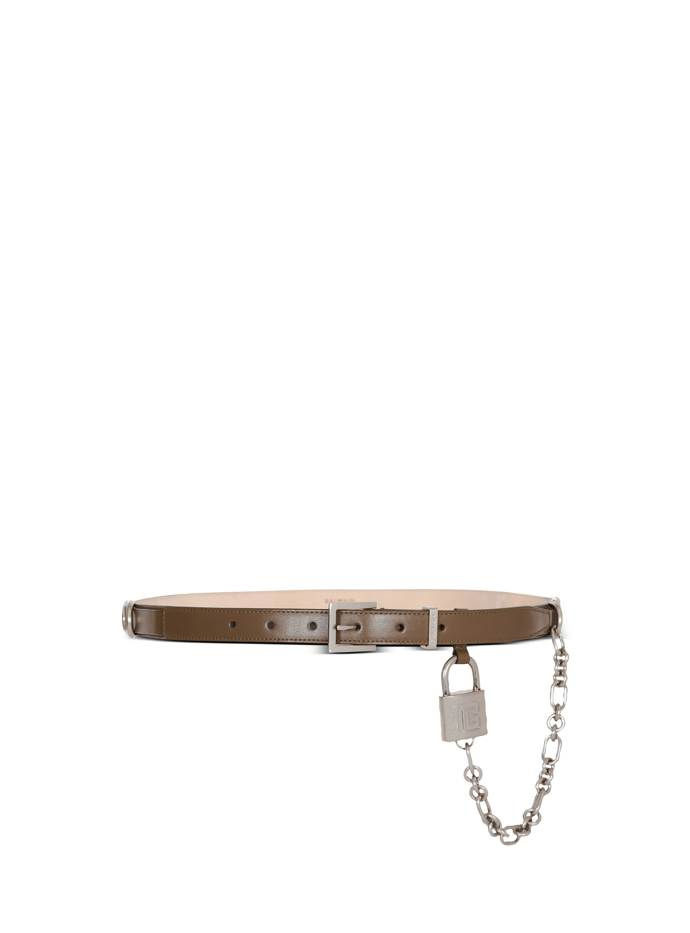 Sync narrow calfskin leather belt - Adjustable fastening - Gold metal buckle - Balmain-engraved gold metal belt loop - 4 metal half-rings - Dangling chain - PB-engraved golden metal lock - Embossed Balmain logo on the inside - Width: 2 cm - Main material: 100% calfskin - Made in Italy - Item: FM1WJ080LSLX