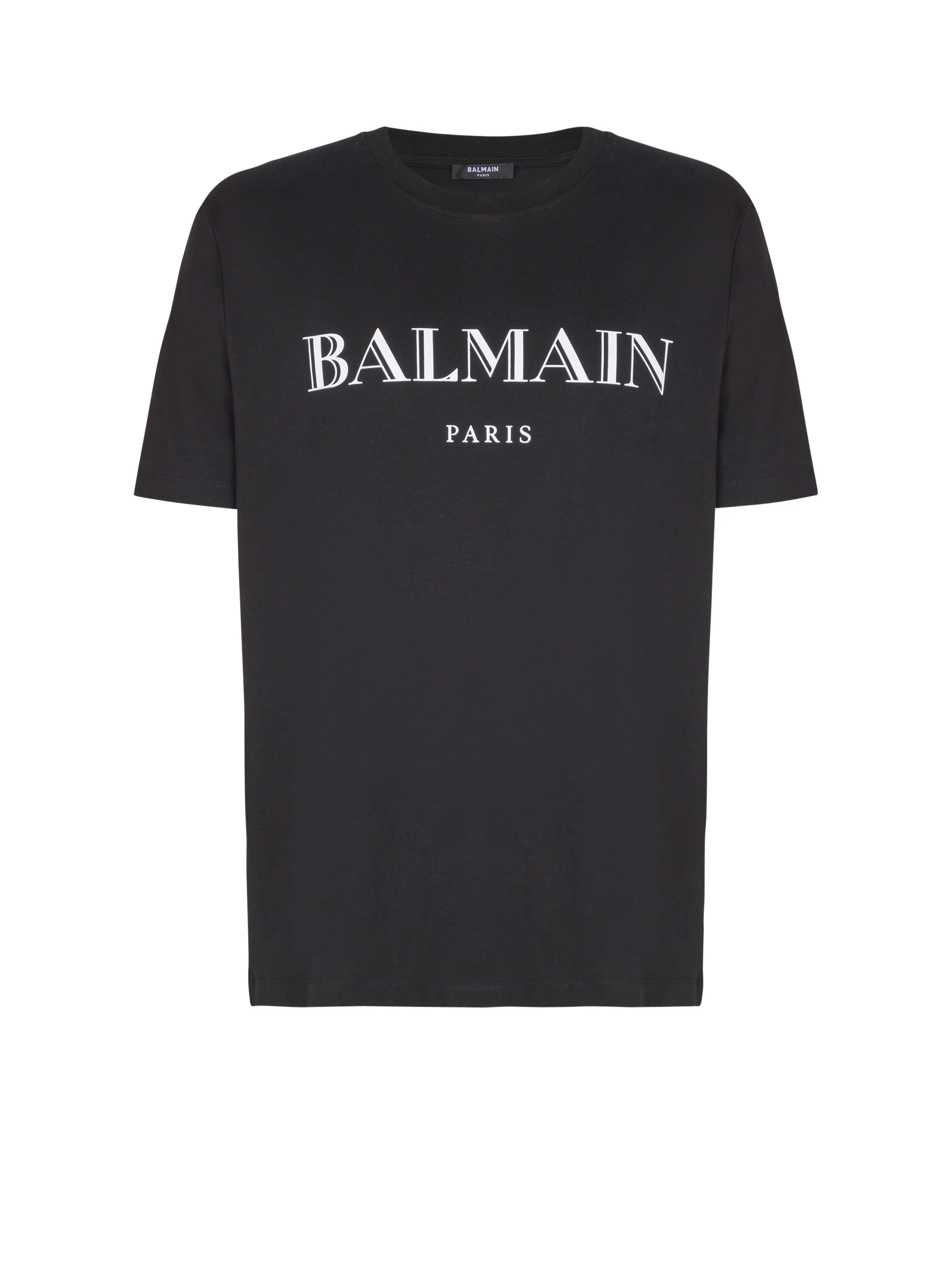 T-shirt with Balmain print - Regular fit - Round neck with ribbed trim - Short sleeves - Vintage Balmain logo printed on the front - Model measures 190cm and wears a size M - Main material: 100% cotton - Made in Portugal - Item: FH2EG000BD28