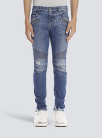 Blue cotton jeans Ridges at knees, two zipper pockets, five pockets, belt loops, intentionally ripped and faded areas Tapered cut Fits true to size, select your usual size The model is wearing a size 30 The model's height is 186 cm / 6 ft 1 in, bust 96 cm / 38 in, waist 69 cm / 27 in, hips 90 cm / 35 in Made in Italy Materials: 98% Cotton, 2% Elastane Item: VH1MH005031D6AA